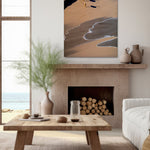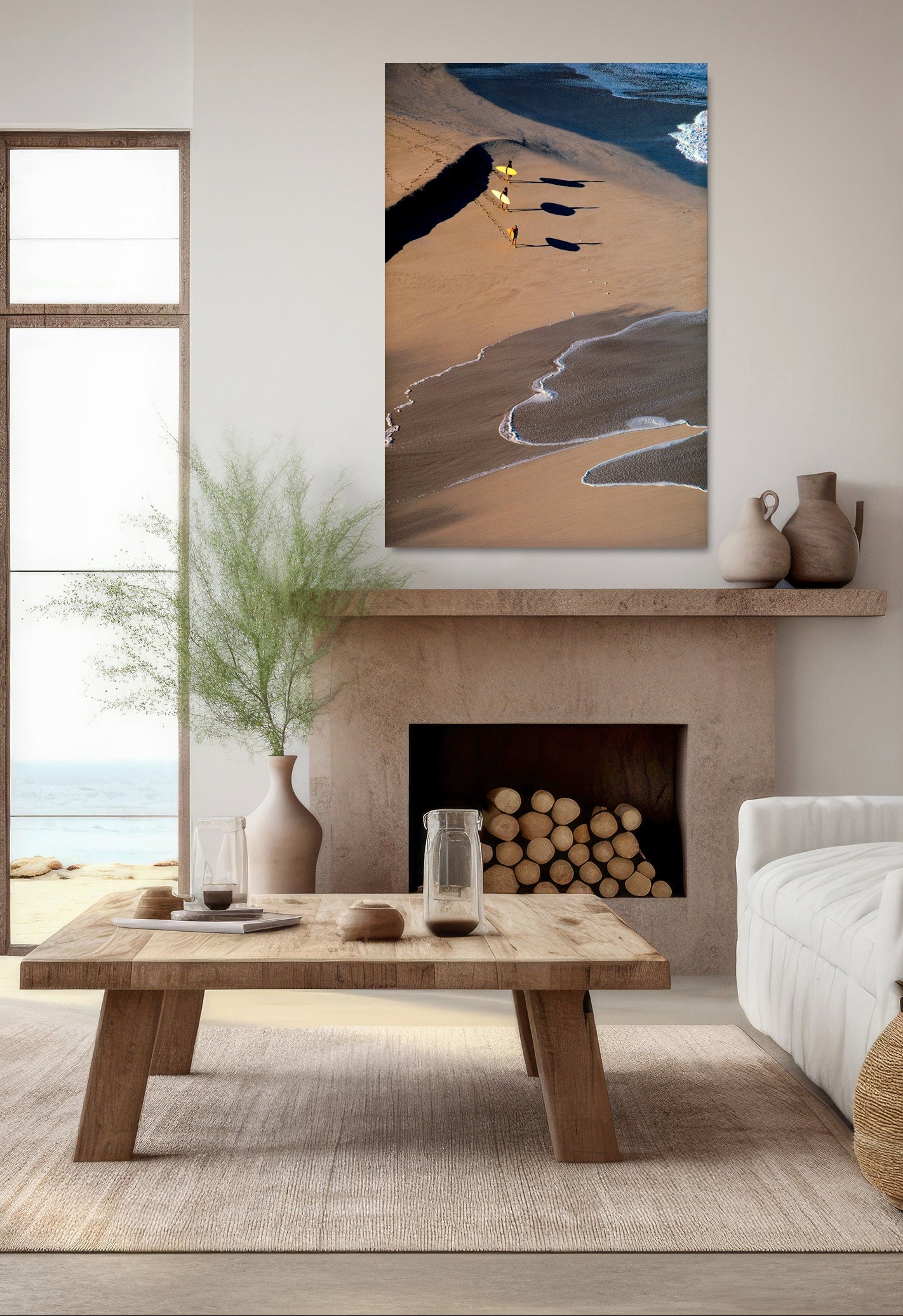 Shot on Kodachrome 35mm film, the image immortalizes 3 surfers as they prepare to face 25 foot waves. Their long shadows stretching across the sand in a moment of quiet, heavy anticipation.