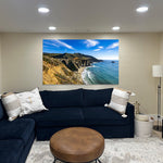 This stunning photo captures the breathtaking beauty of the Bixby Bridge and its surrounding coastal landscape along California’s Big Sur.