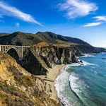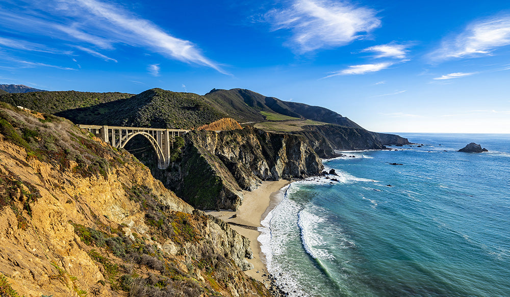 The rugged cliffs, golden hues of the rocky terrain, and the sparkling blue Pacific Ocean create a dramatic contrast that highlights the area’s natural splendor. The graceful arch of the bridge blends seamlessly with the scenery, making it a perfect example of harmony between architecture and nature.