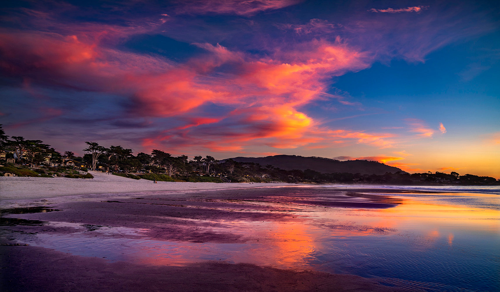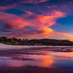 A breathtaking sunset illuminates the sky over Carmel Beach with vibrant hues of orange, pink, and purple, creating a spectacular reflection on the wet sand below.