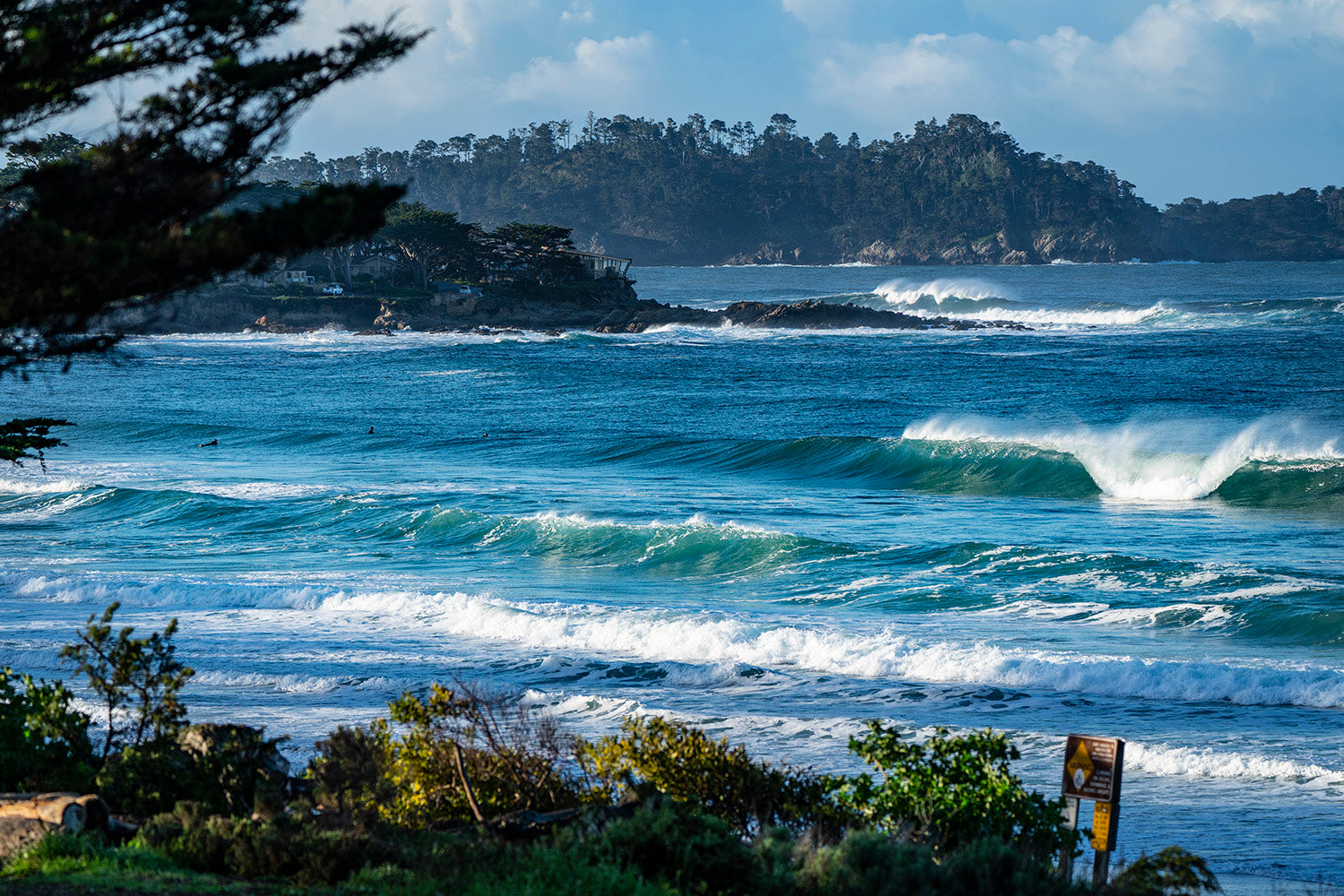 This photo captures the dynamic beauty of Carmel’s coastline, where waves roll in gracefully under a vibrant blue sky.