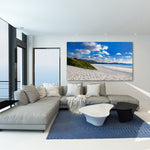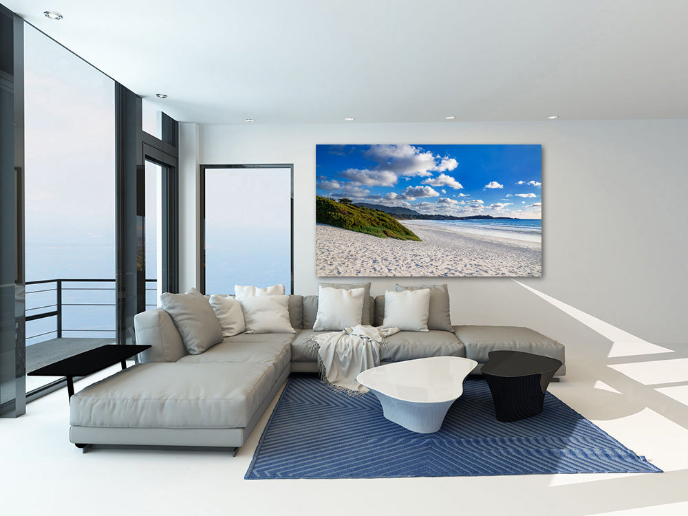 The image showcases Carmel Beach’s pristine white sand shoreline stretching along the pristine waters of the Pacific.