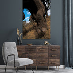 The perspective creates a sense of being right next to the animal, highlighting its connection to the earth and its surroundings.
