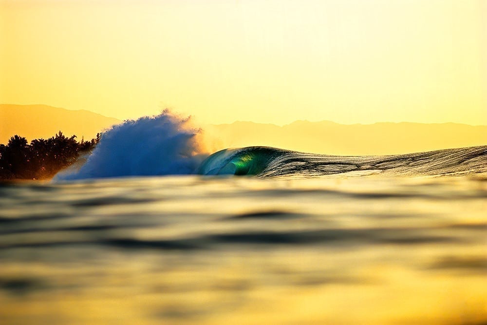 The image showcases a perfectly formed barrel, its translucent green hues illuminated by the warm glow of the setting sun.