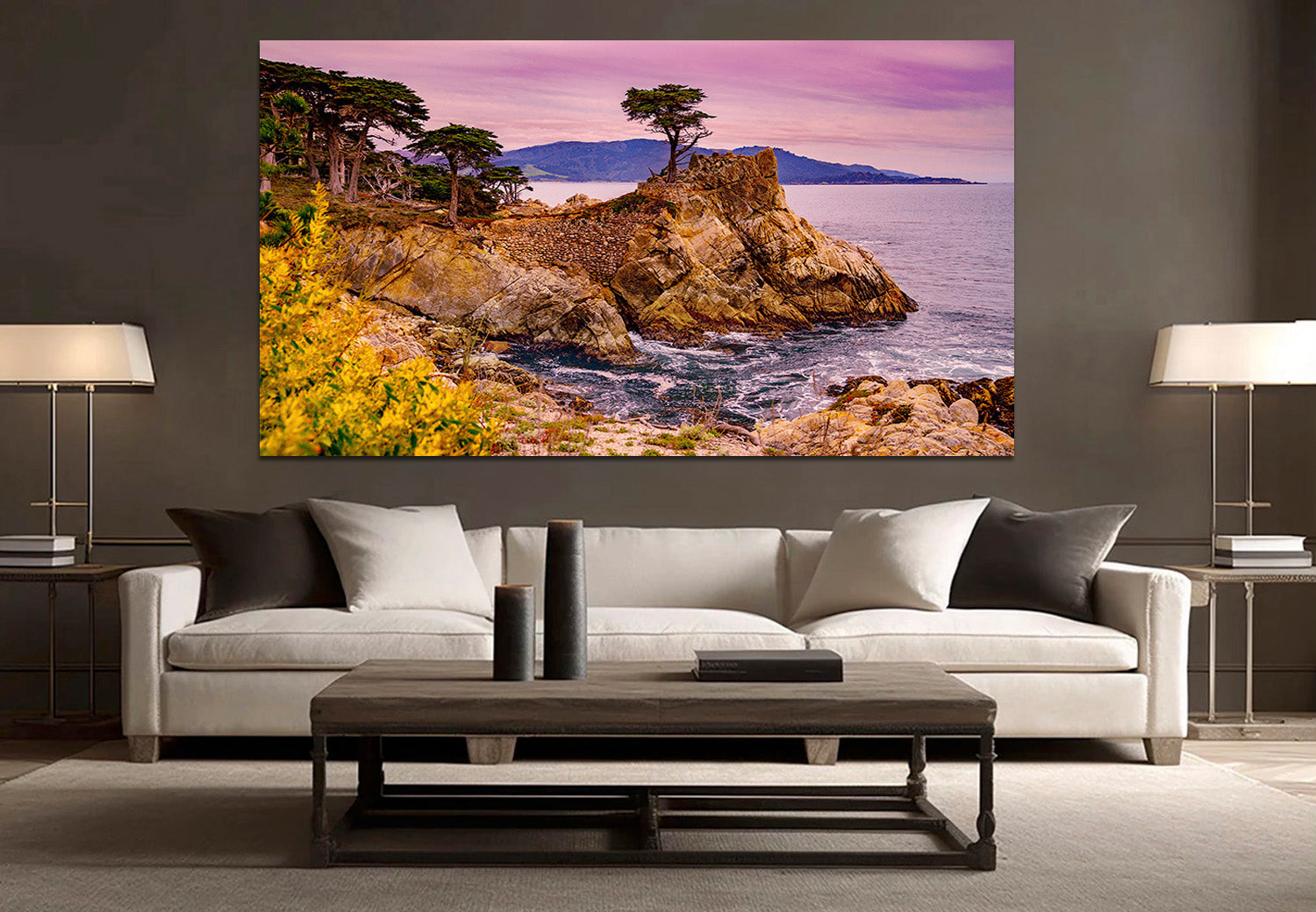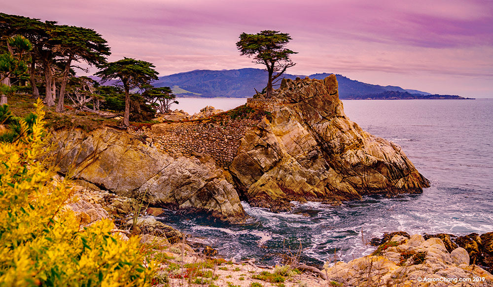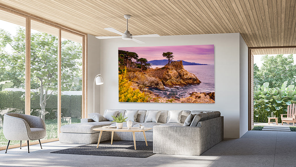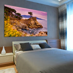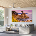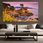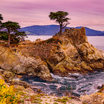 This breathtaking image showcases the iconic Lone Cypress, perched dramatically on a rugged granite outcrop overlooking the Pacific Ocean in Pebble Beach, California. Set against a vibrant sky with hues of pink and purple, the scene captures the timeless beauty of the Monterey coastline.