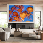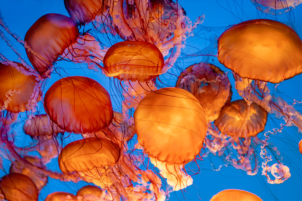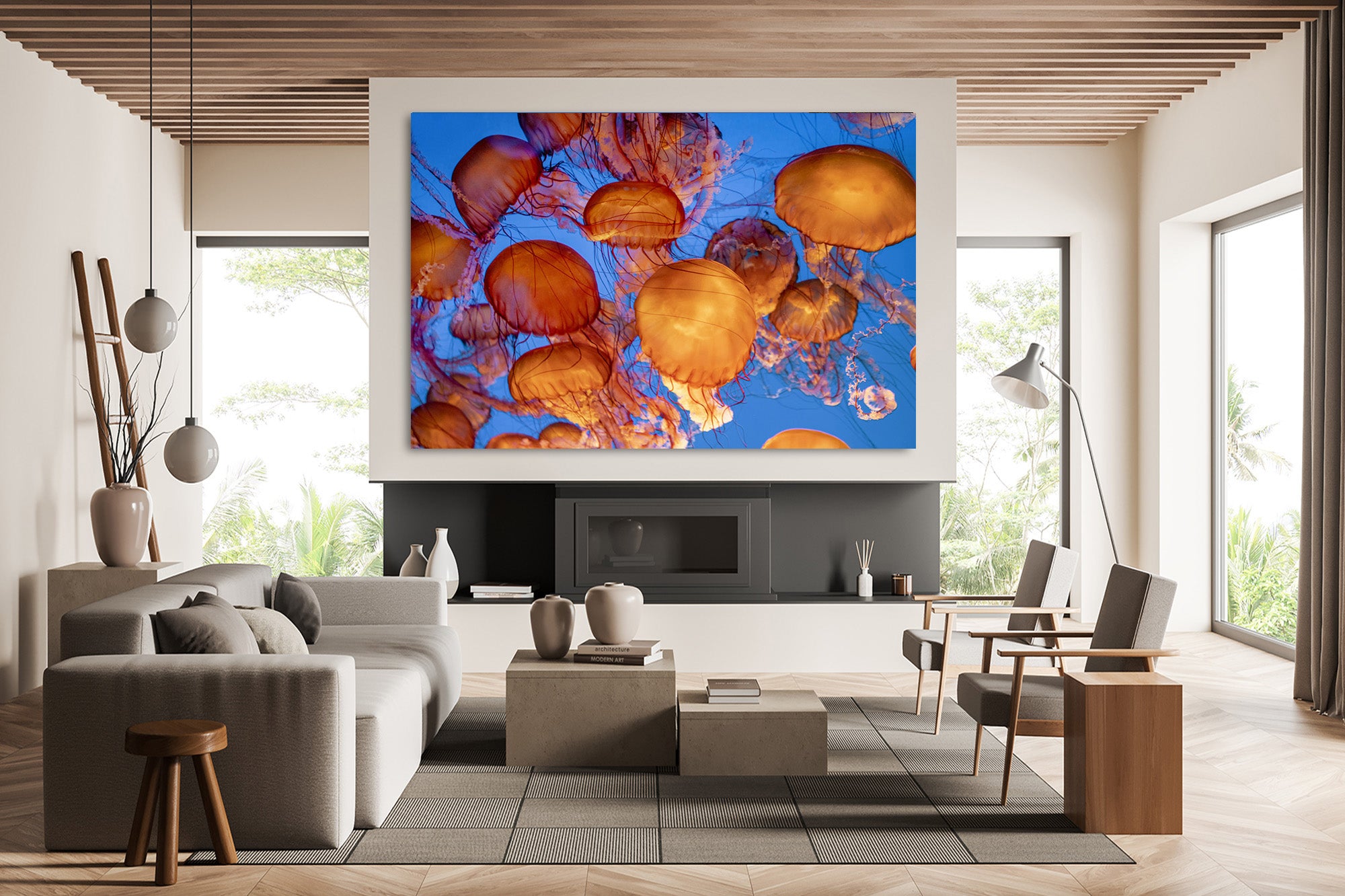 The jellyfish, with their translucent, orange-hued bell-shaped bodies, radiate warm colors and contrast beautifully with the cool tones of the water.