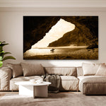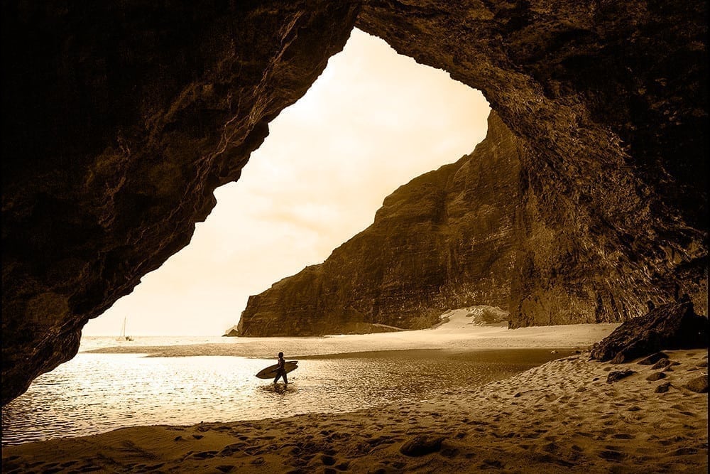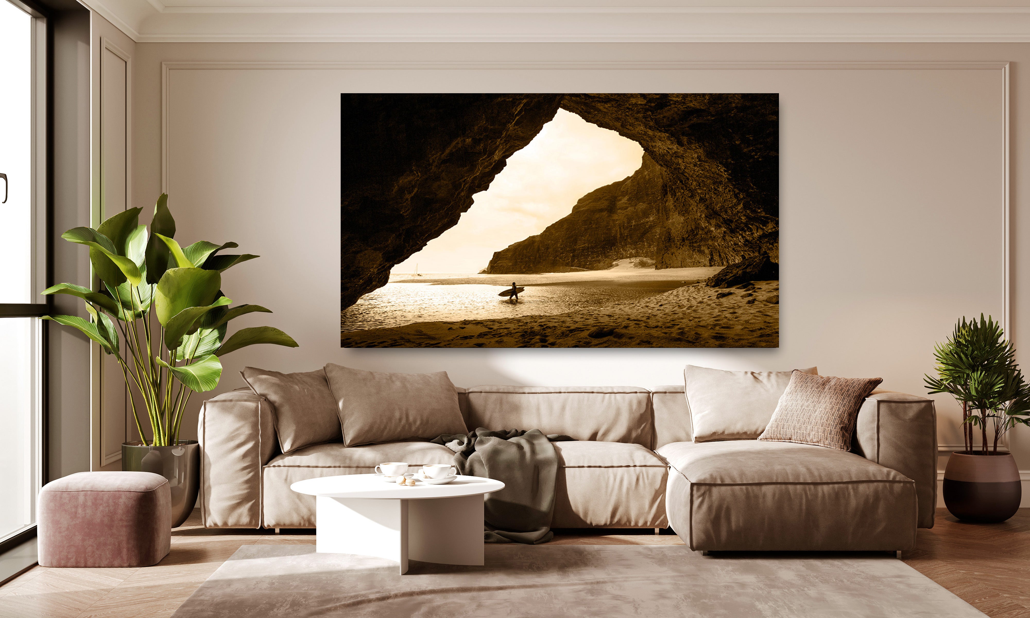 Framed by the rugged contours of a cave, the image opens up to reveal a secluded beach bathed in warm golden light. A lone surfer, silhouetted against the shimmering water, walks gracefully with her surfboard, embodying the spirit of adventure and connection with nature.