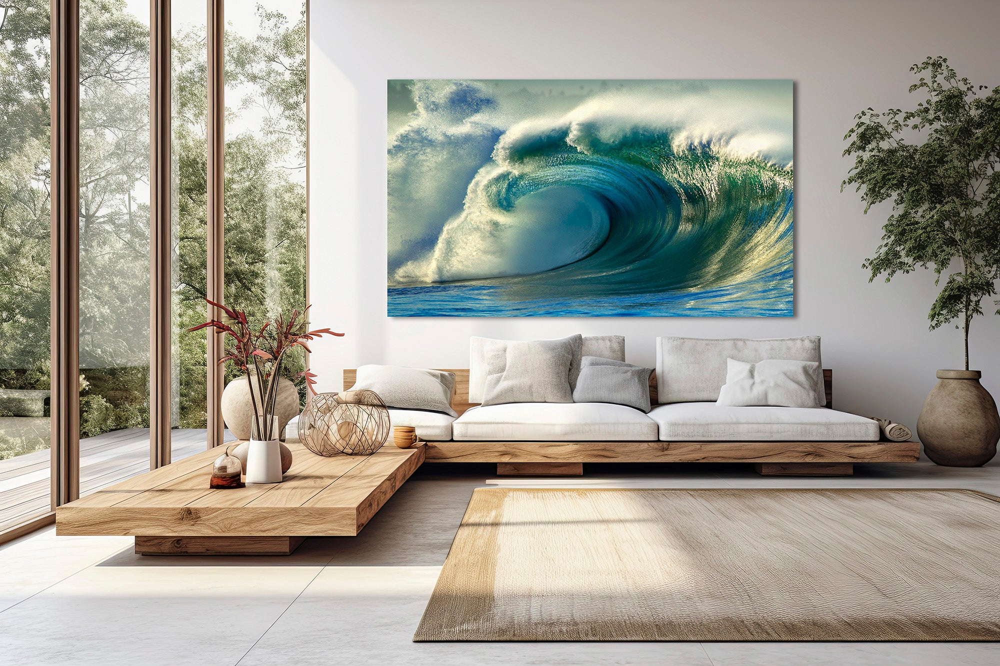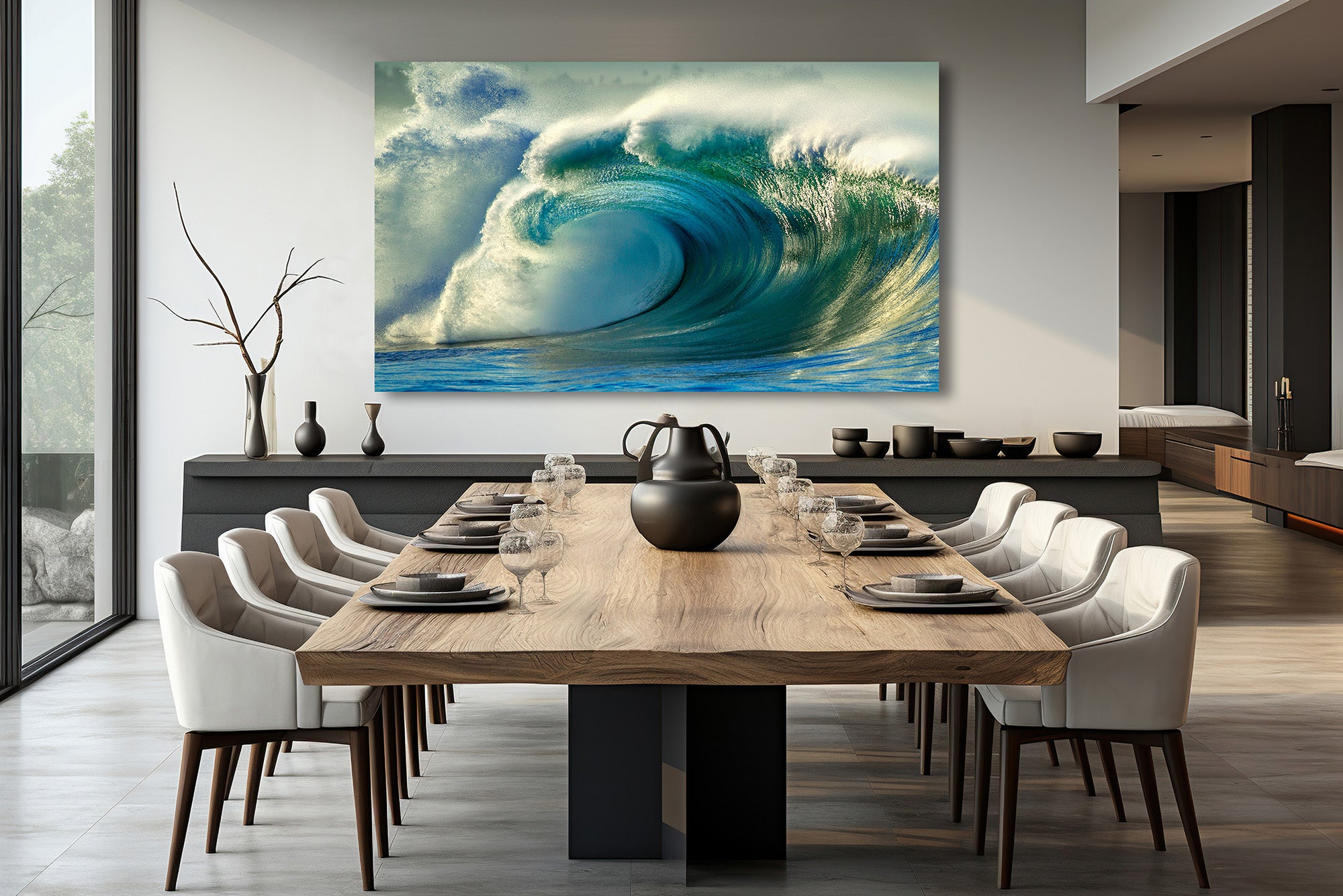 The interplay of light and water creates a mesmerizing display of color and texture, with the wave’s translucent green hues contrasting beautifully against the sun-kissed spray. This stunning capture not only freezes a fleeting instant of oceanic power but also evokes the timeless allure of the coastline.