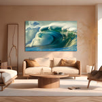 The image showcases the awe-inspiring moment when an emerald wave crests and breaks along the Pacific Coast, its powerful form illuminated by the golden rays of the morning sun.