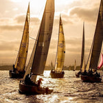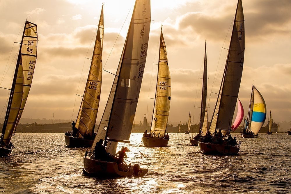 The composition of this image, the splash of color of the sail and the ray of sun on the silhouette sets a fun, breezy tone of life on the San Diego Bay.