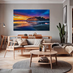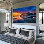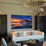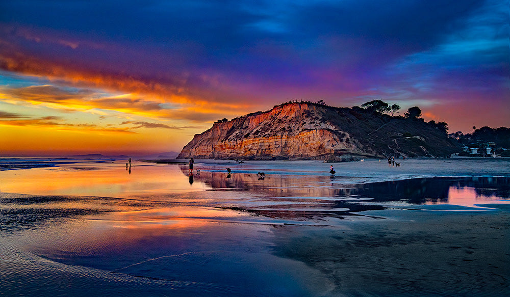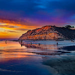 This stunning photograph captures the serene beauty of a sunset in Del Mar, California. The vibrant hues of orange, purple, and blue paint the sky and reflect off the wet sands, creating a mesmerizing mirror effect.