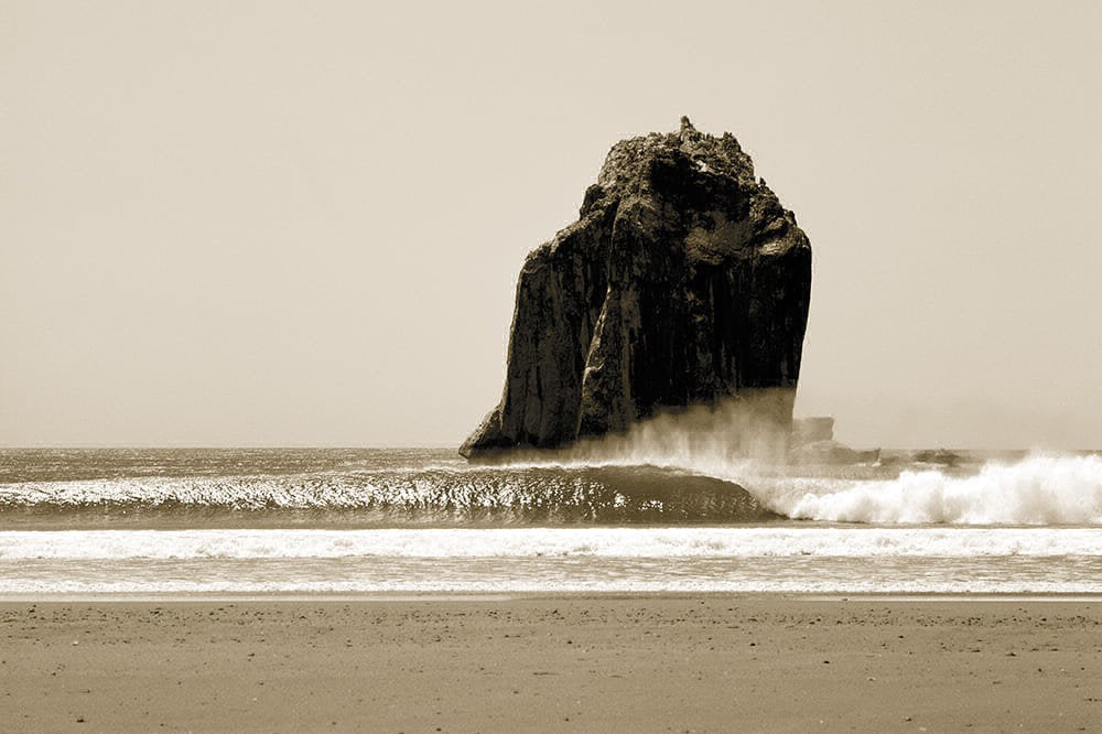 The towering volcanic rock stands solitary against the vast Pacific Ocean, framed by a perfectly peeling wave that embodies the area’s world-renowned surf conditions.