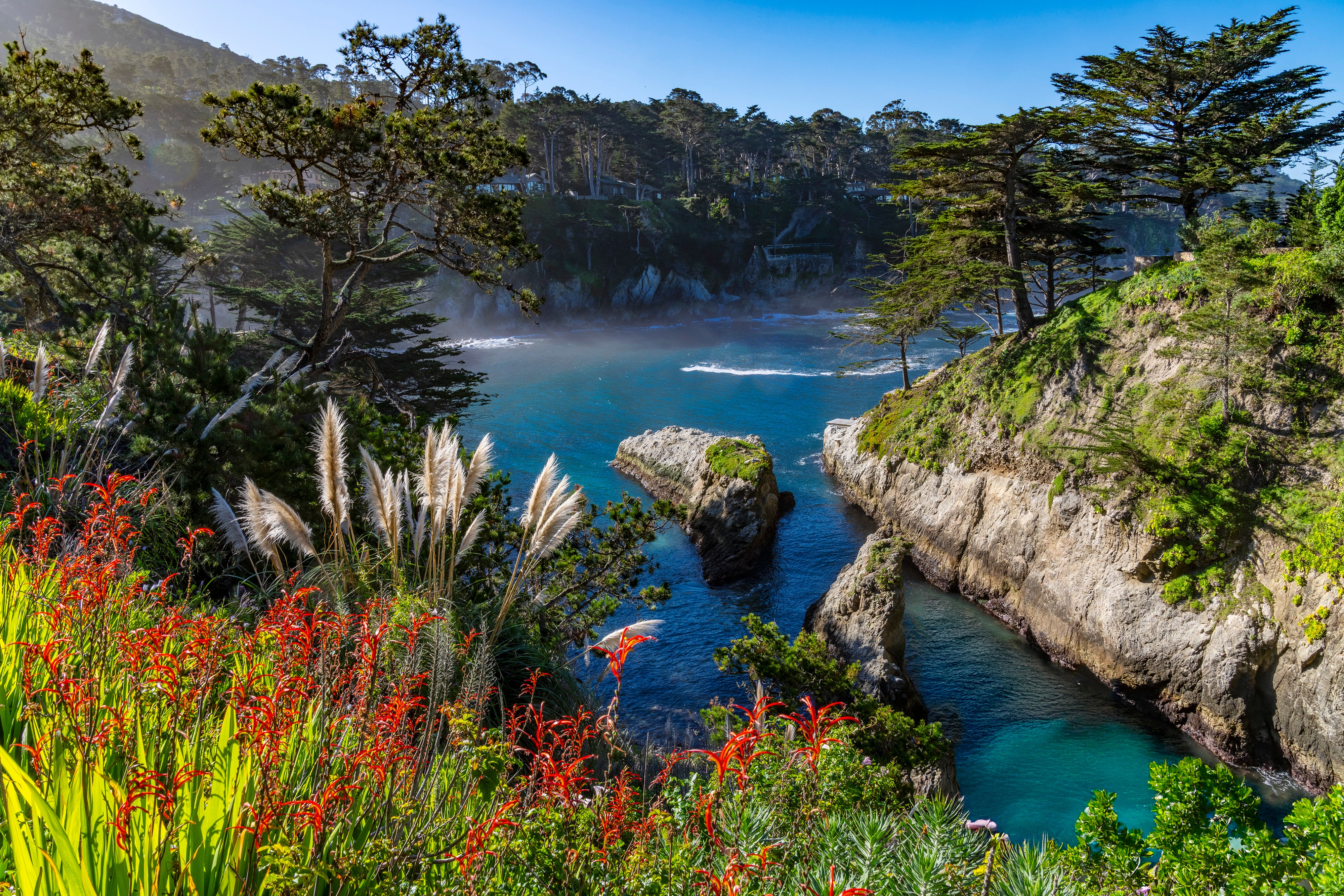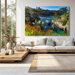 A hidden cove along the rugged Carmel Highlands coastline comes alive in this stunning fine art photograph, where vibrant wildflowers and silver pampas plumes frame the pristine Pacific, tucked between ancient sea cliffs.