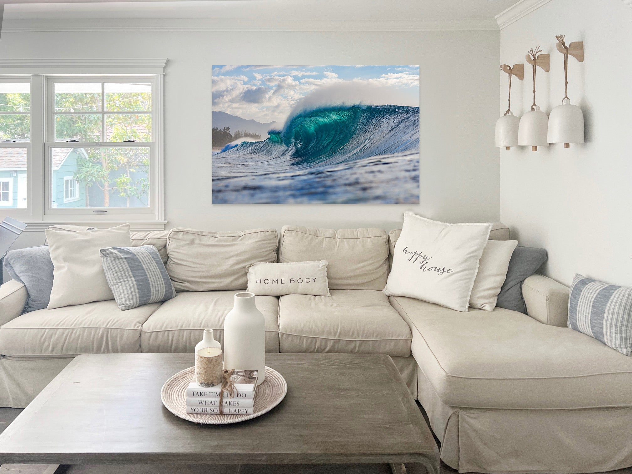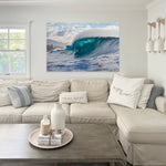 Luminous sunlight filters through its turquoise crest, highlighting its powerful energy and breathtaking majesty. This iconic piece brings the exhilarating spirit of the ocean into any space, celebrating its wild and awe-inspiring nature.