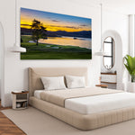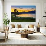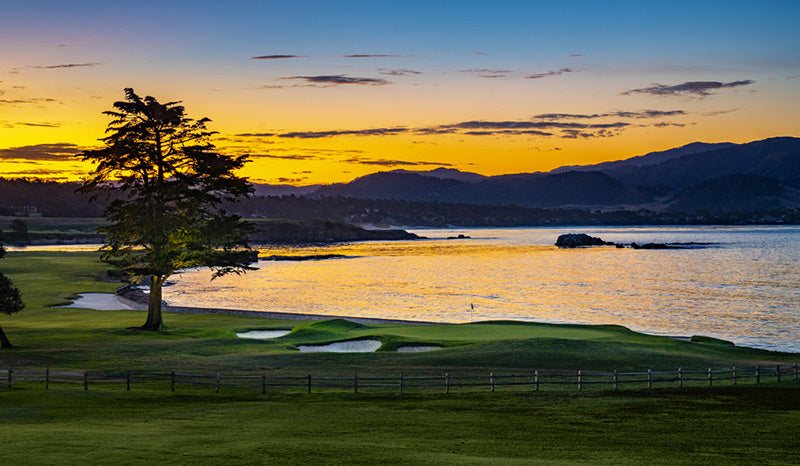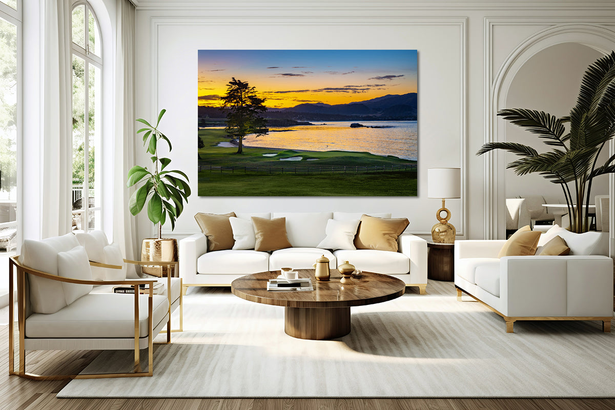 The legendary 18th hole at Pebble Beach showcases a flawlessly manicured green set against the breathtaking backdrop of Carmel Beach.