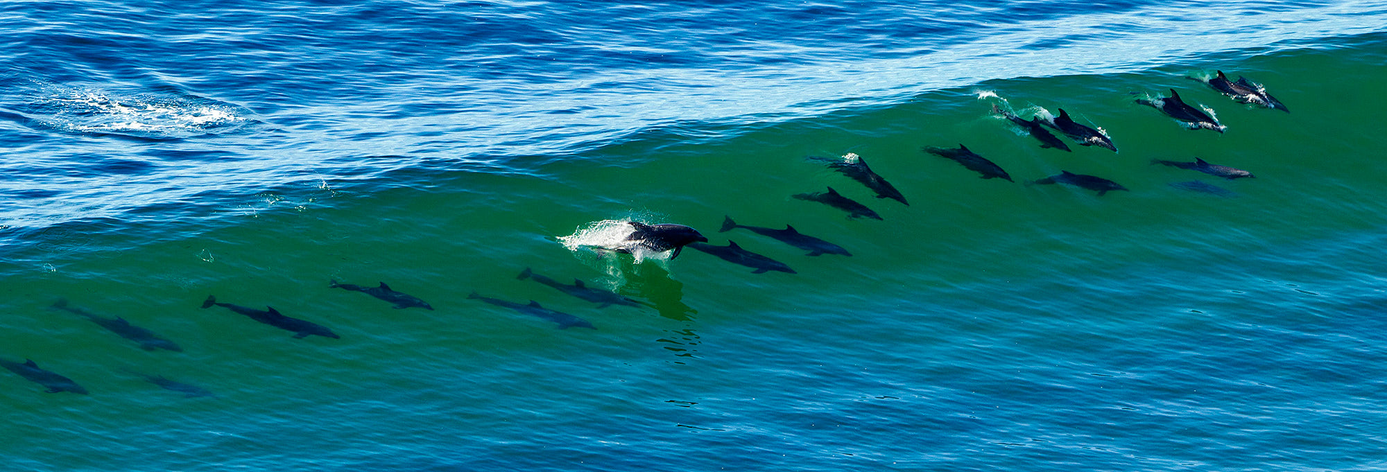 A mesmerizing blend of movement, light, and nature’s artistry, this photograph captures a pod of dolphins surfing a turquoise wave along the San Diego coastline.