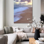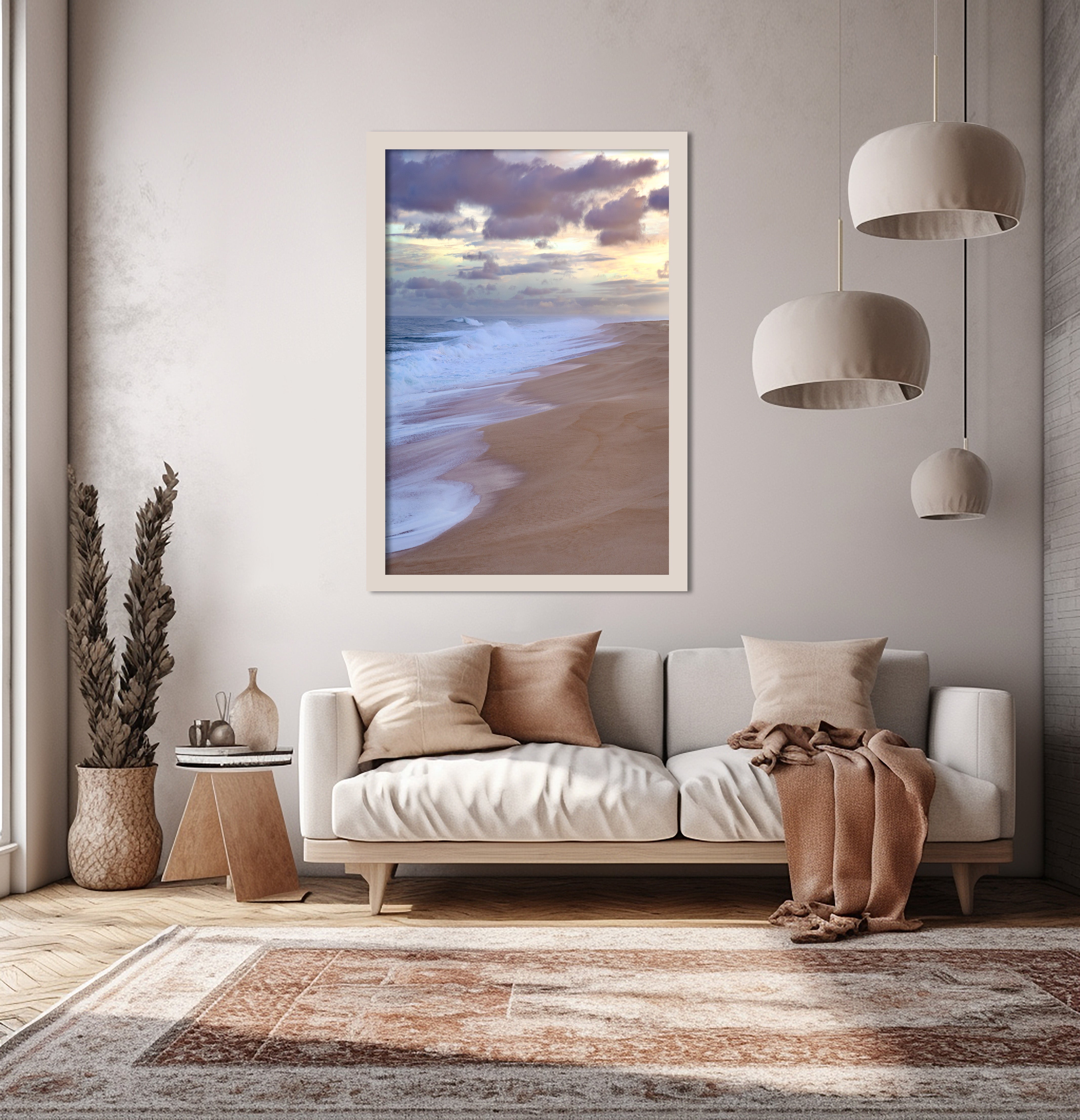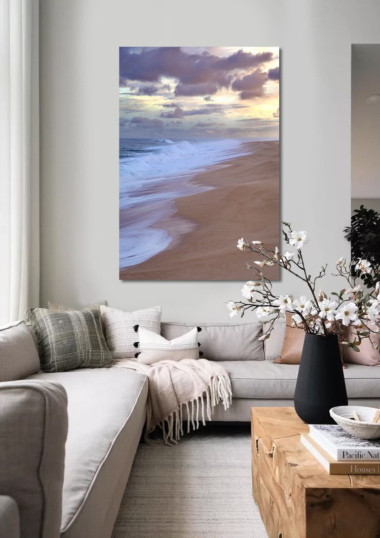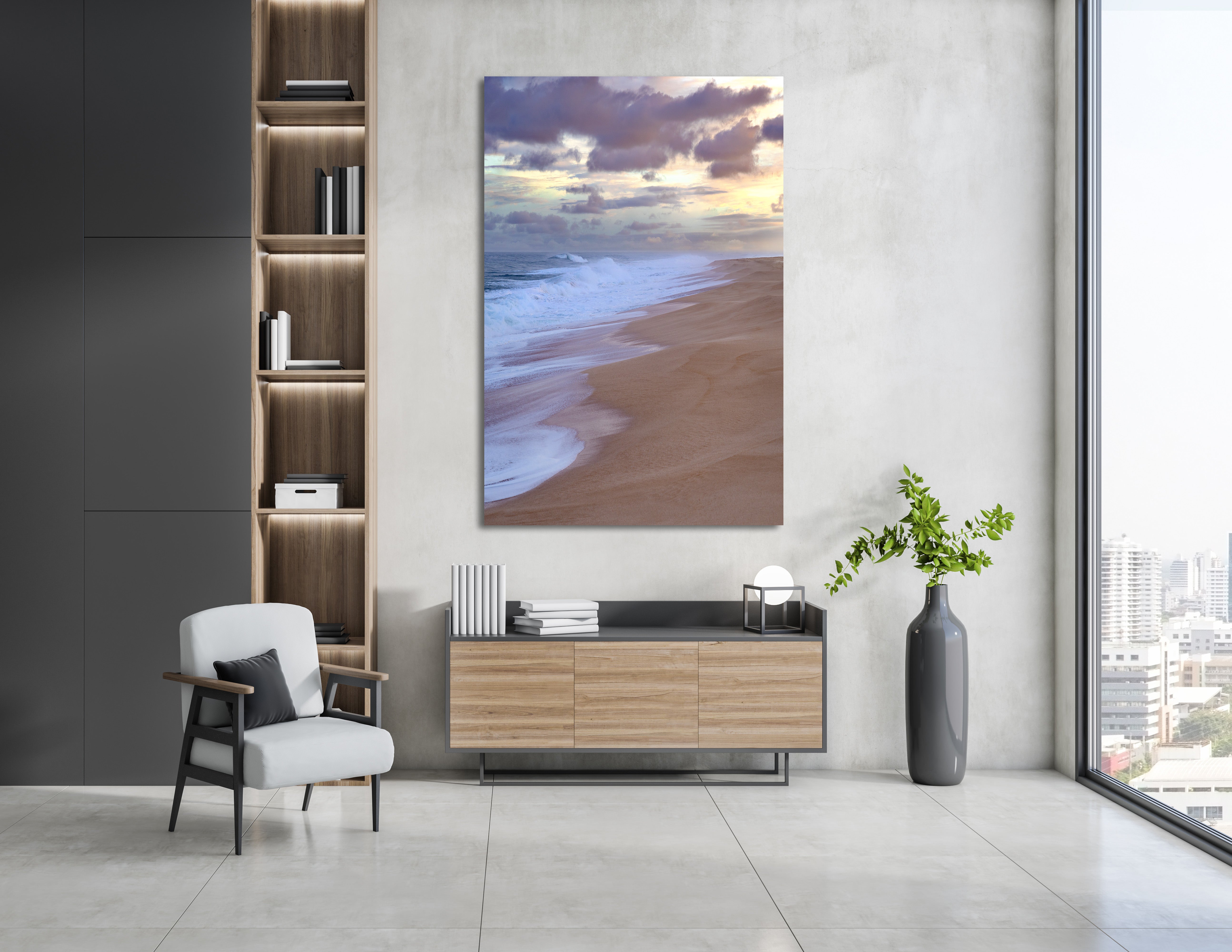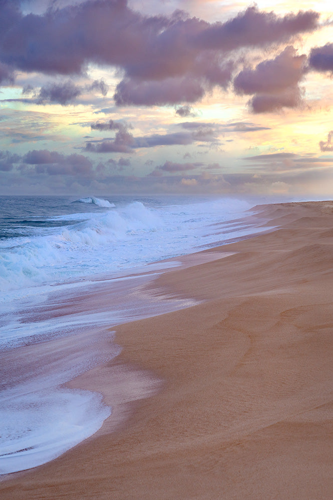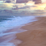 Immerse yourself in the tranquil beauty of this fine art photograph, walking along a warm beach at sunrise, where the gentle waves of the Hawaiian Pacific gracefully sculpt the soft, golden sand. This serene composition evokes a sense of calm and connection to nature, making it a perfect addition to any space seeking to inspire relaxation and coastal charm.