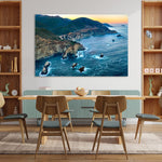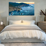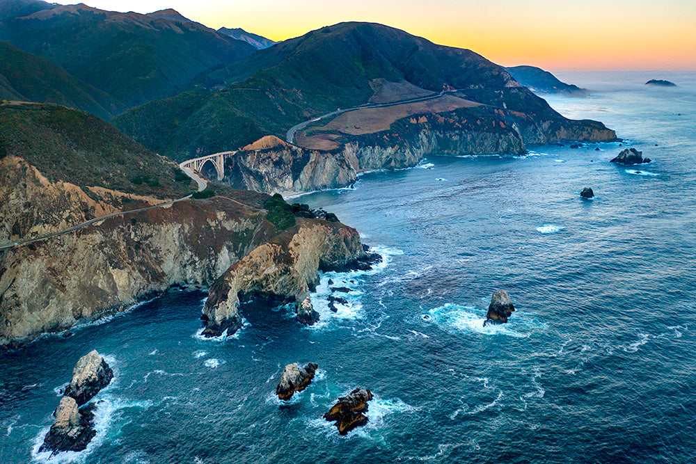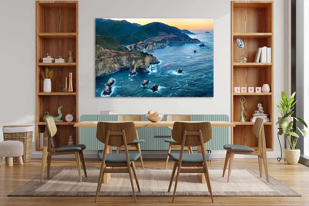 This fine art photograph captures the iconic Bixby Bridge at sunrise along the dramatic Big Sur coastline in California.