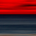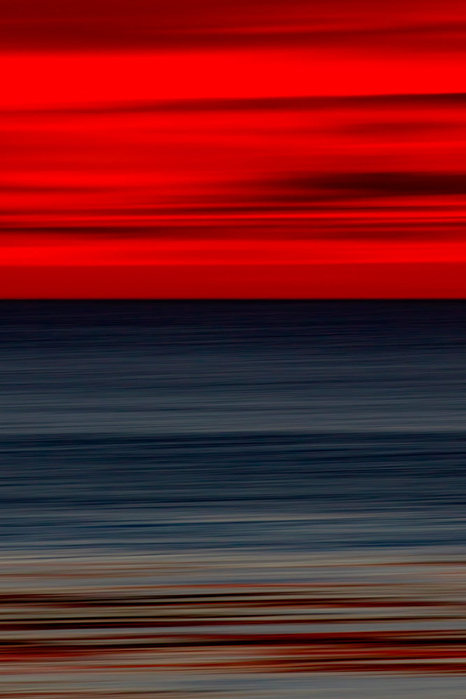A slate grey ocean is captured after the sun dips below the horizon, painting the sky in fiery amber tones. The reflection of red accents in the foreground adds color and depth to this intensely beautiful portrait of the Pacific.