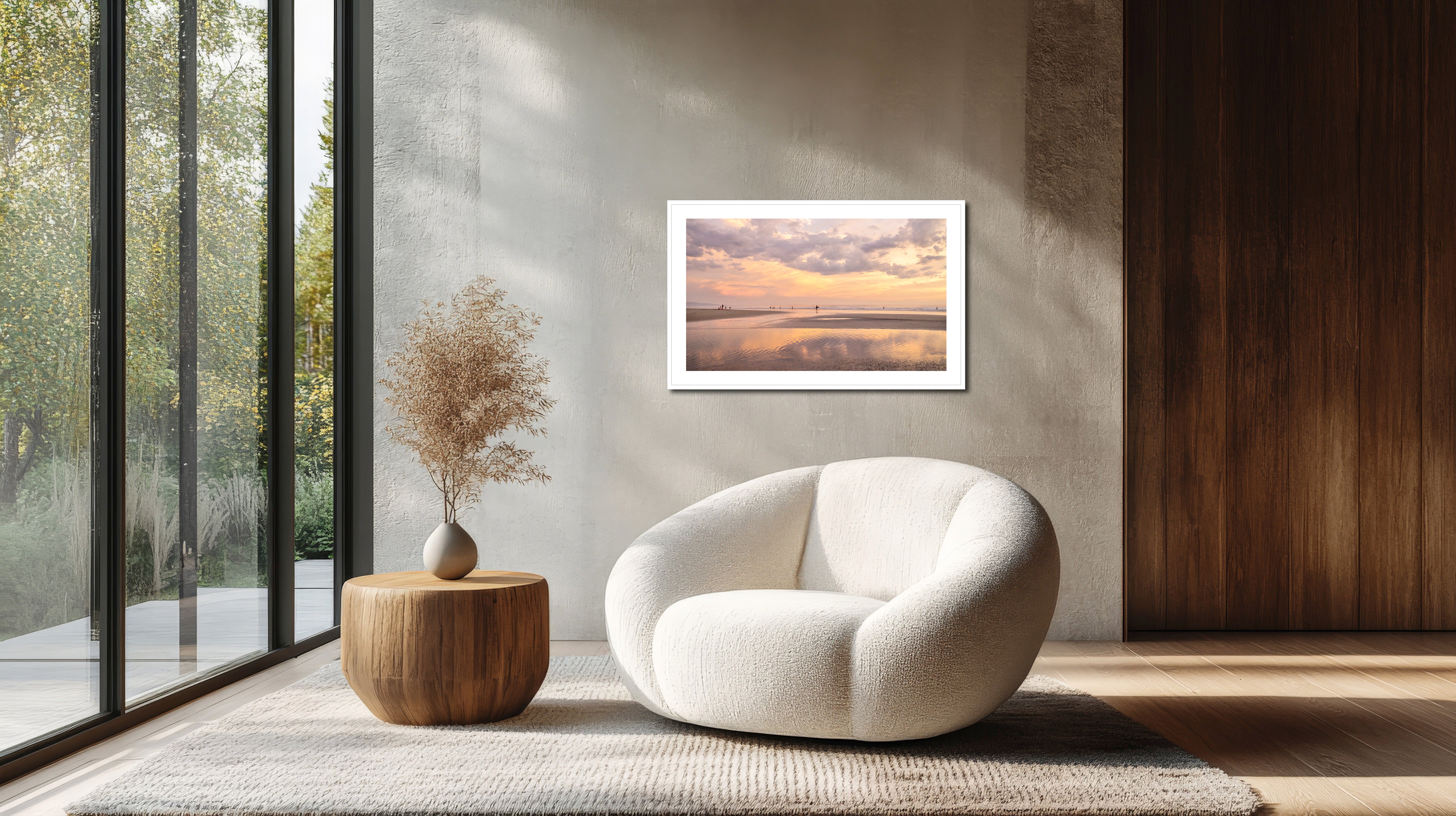 Small figures and a distant surfer drift through the scene, enveloped in the vastness of the horizon—a serene pause where the stillness of the sea mirrors the calm within.