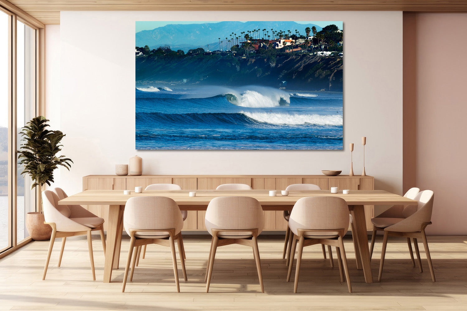 Towering sandstone cliffs rise dramatically from the beach, crowned with iconic California palm trees and coastal homes perched along the bluff’s edge.