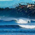 This captivating image showcases a pristine Southern California surf break nestled between Solana Beach and Cardiff-by-the-Sea, where powerful blue waves curl and crash against the shoreline.