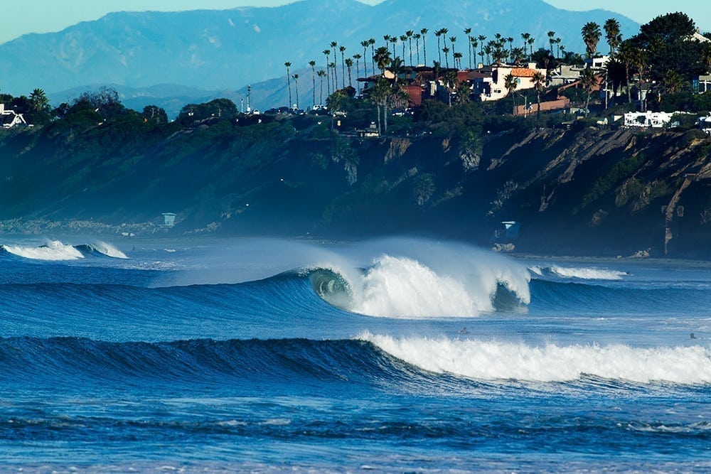 The scene captures the quintessential Southern California coastal aesthetic, with majestic mountains visible in the background creating a stunning layered landscape from ocean to mountains.