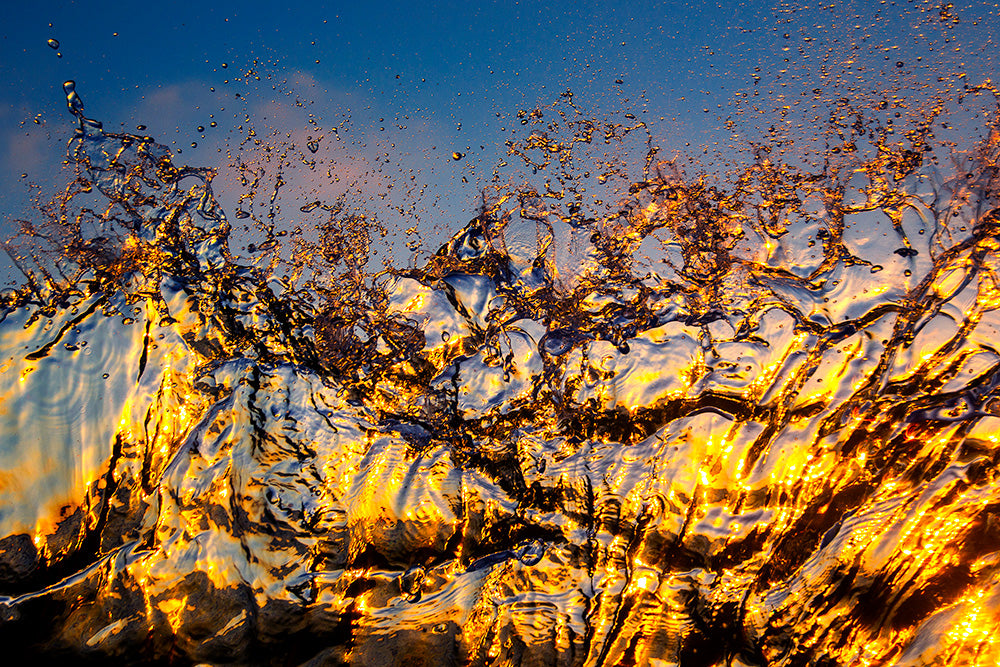 A rich golden sunset illuminates the ocean, casting a warm glow across the water as a wave explodes in a coral fan shape.