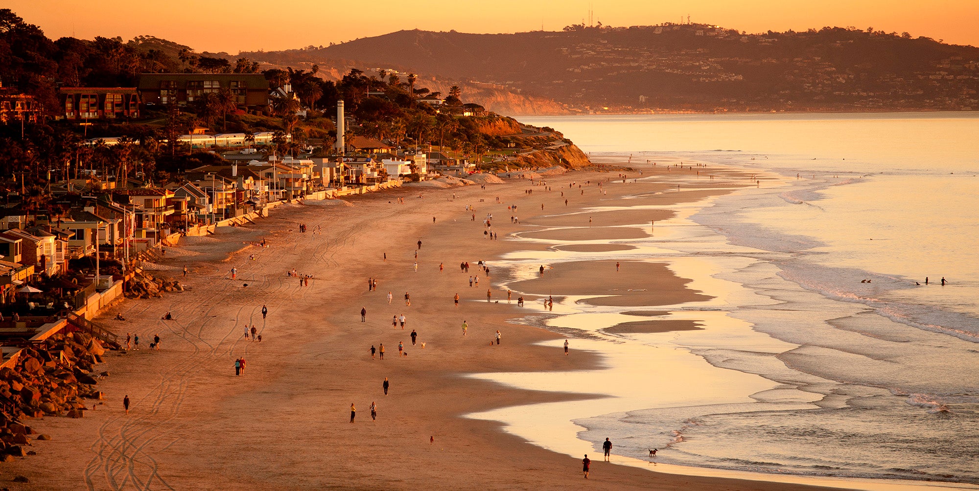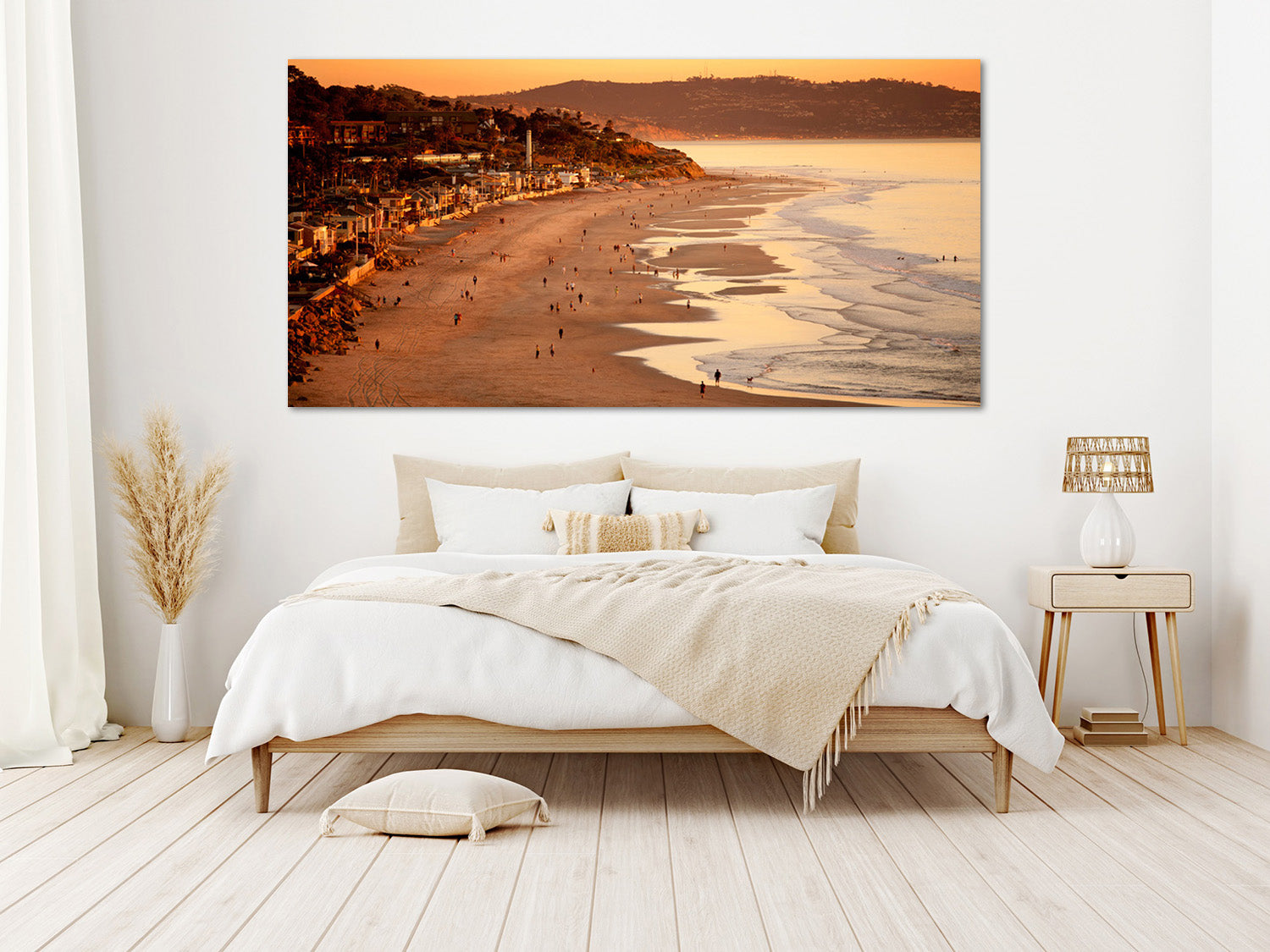 This captivating photograph showcases the serene beauty of Del Mar, California, as the sun sets over the coastline.