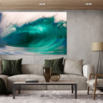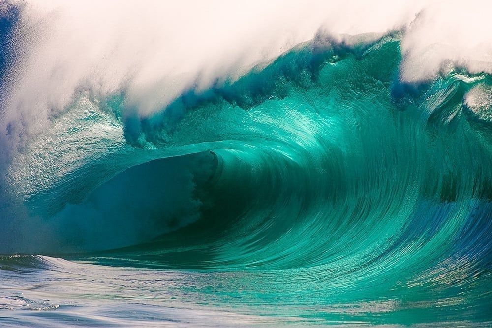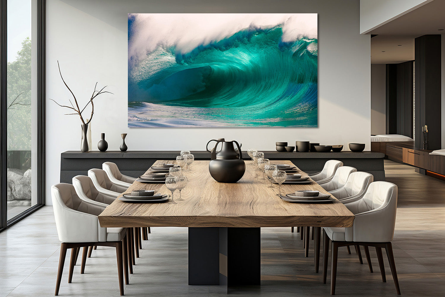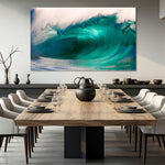 The crest of the wave curls over dramatically, with white water crashing down, highlighting the wave’s immense force and dynamic motion.