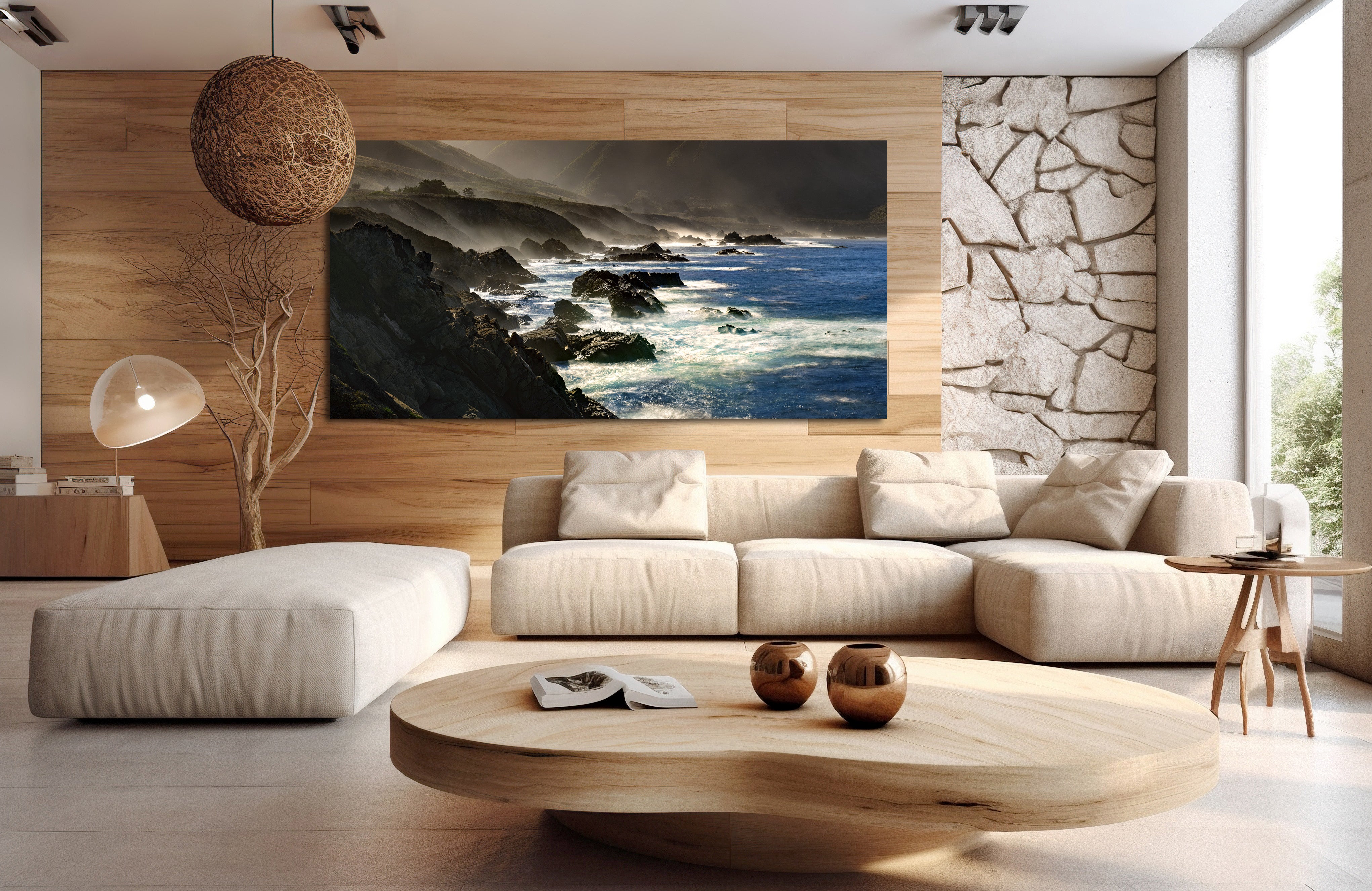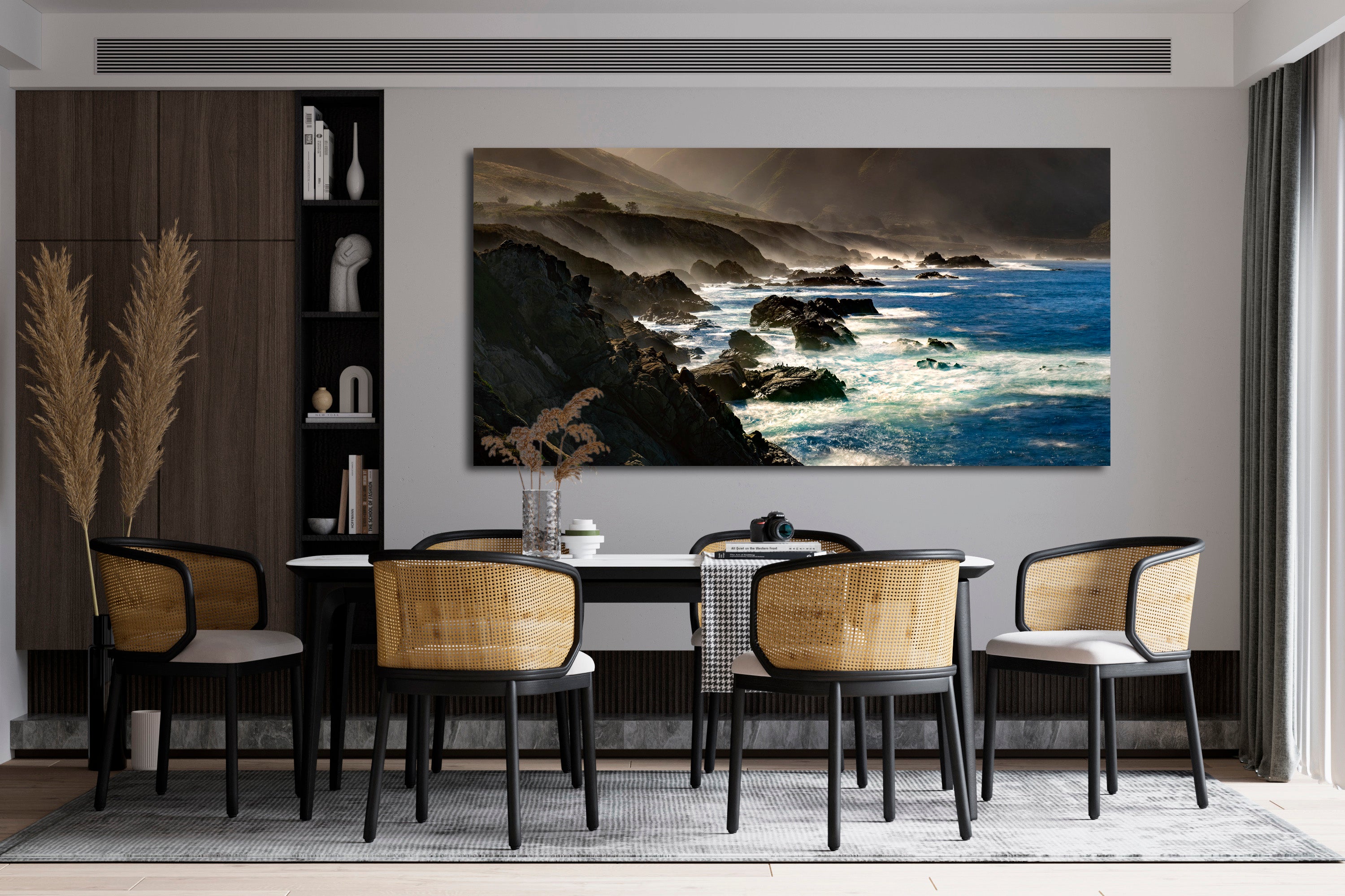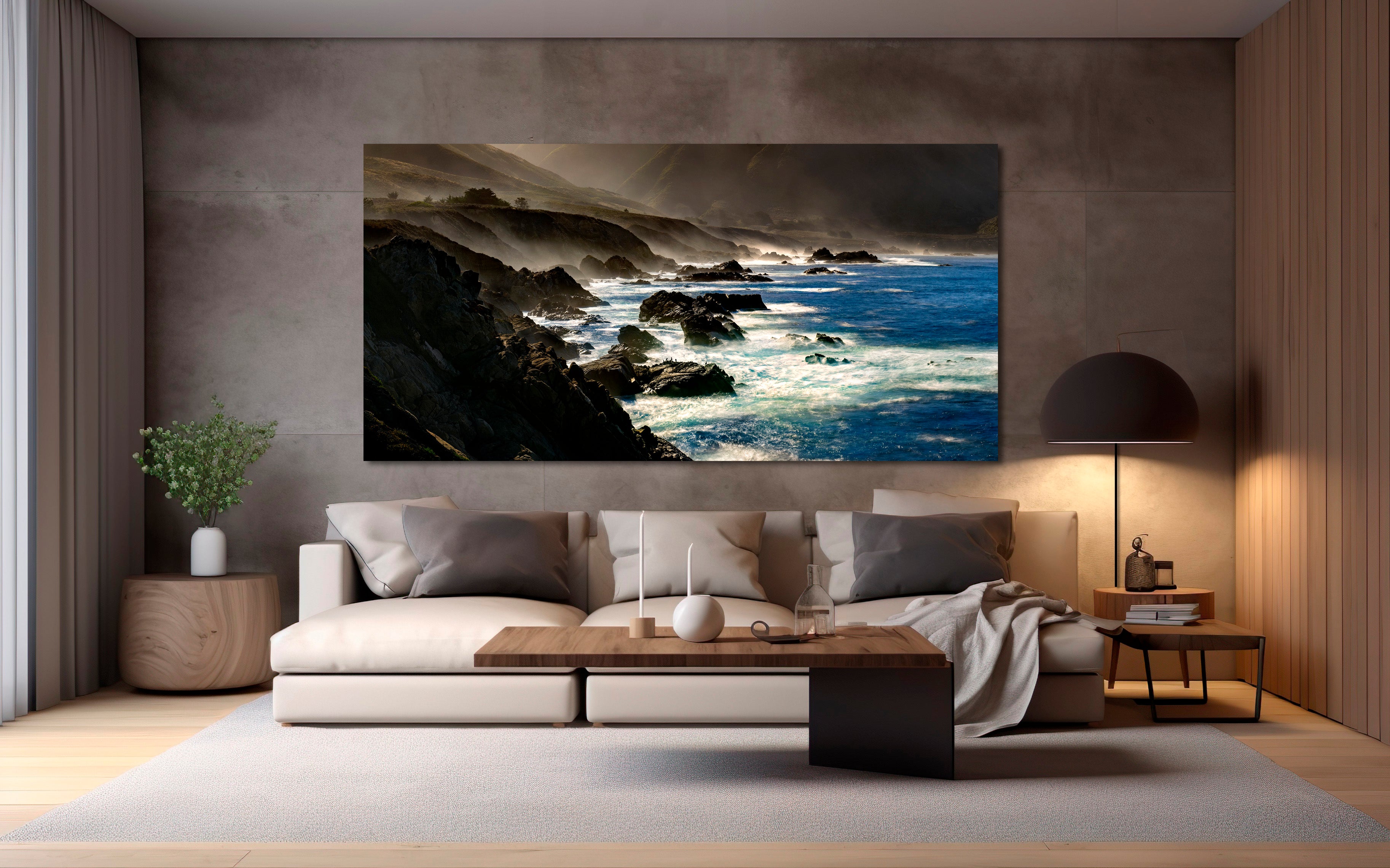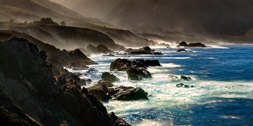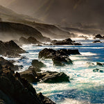 Mist rises gently from the crashing waves and the steep cliffs, creating a moody interplay of light and shadow across the landscape. The blue tones of the wild ocean contrast beautifully with the earthy tones of the cliffs and the soft, diffused sunlight filtering through coastal fog. It is a breathtaking scene that embodies the untamed beauty for which Big Sur is renowned.