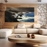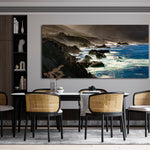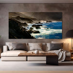 This evocative image captures the rugged coastline of Big Sur, California, where dramatic rocky outcrops meet the swirling waters of the Pacific Ocean.