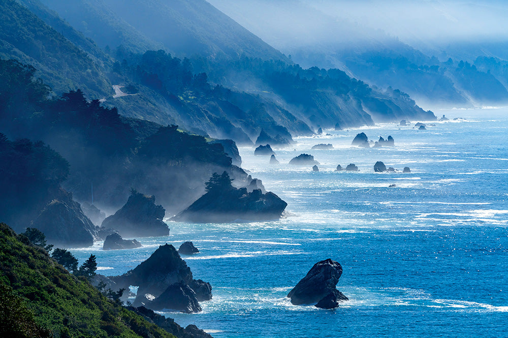 Jagged rocks stretch into the ocean like steadfast sentinels, enduring the relentless force of wind and crashing waves. They form a rugged boundary where the untamed sea meets the rugged, misty cliffs of Big Sur.