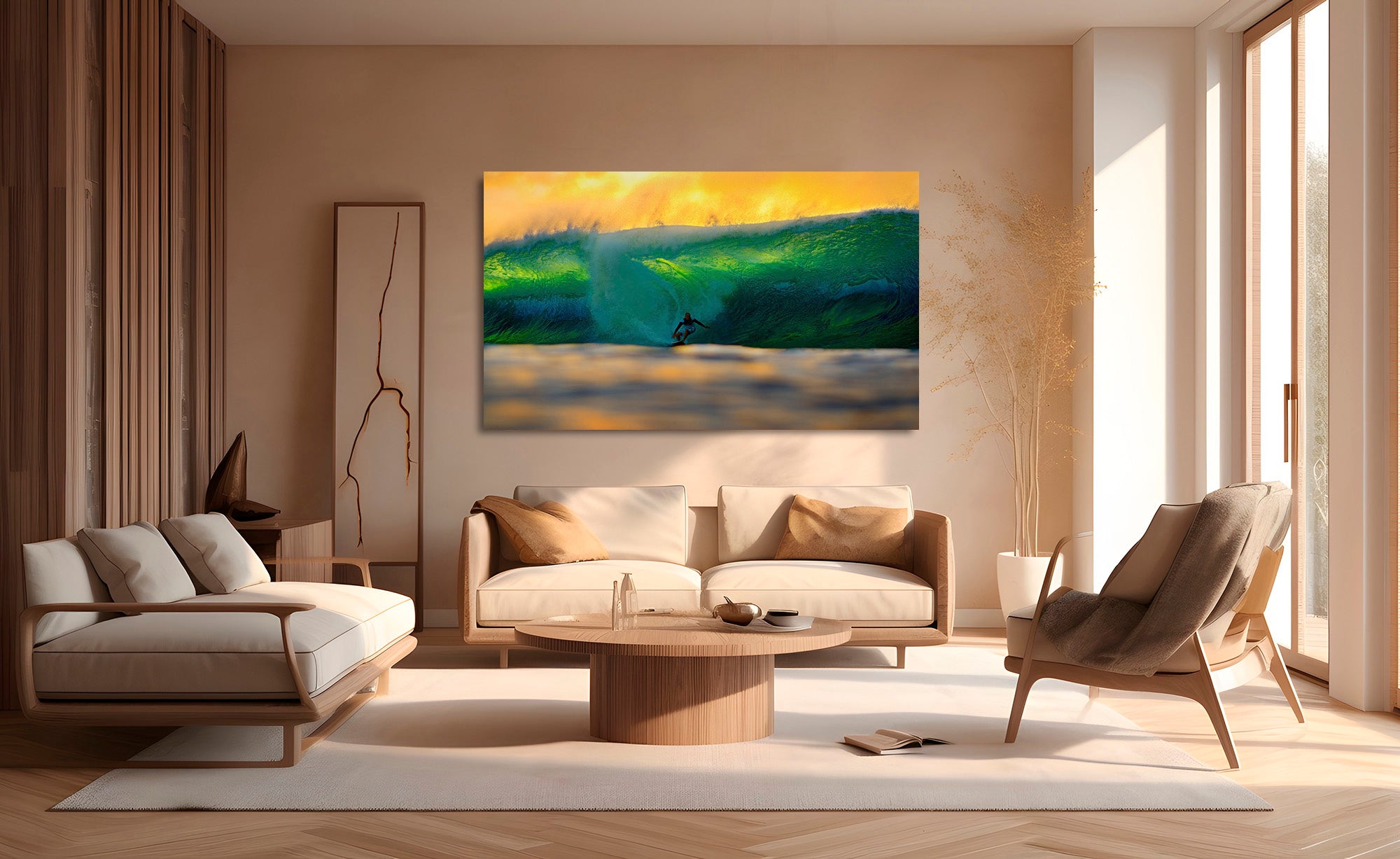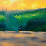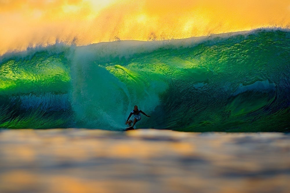 The vibrant hues of the setting sun illuminate the scene, casting a golden glow over the ocean and contrasting beautifully with the emerald green of the barreling wave.