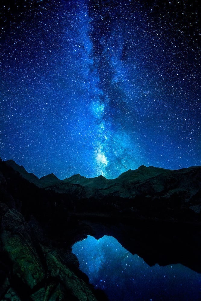 Captured in the Sierra Nevada mountains, a perfectly still alpine lake mirrors the astronomical display, creating a symmetrical reflection that doubles the visual impact of the starry panorama.