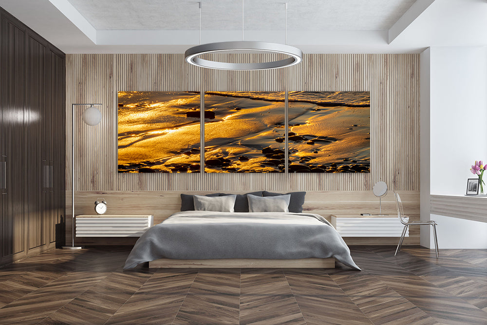 This photograph contrasts the gleaming golden sand of the receding tide with the smooth, dark onyx-colored stones. Nestled in the sand, these polished stones beckon bare feet to soak in the rejuvenating energy of the sea and sun.