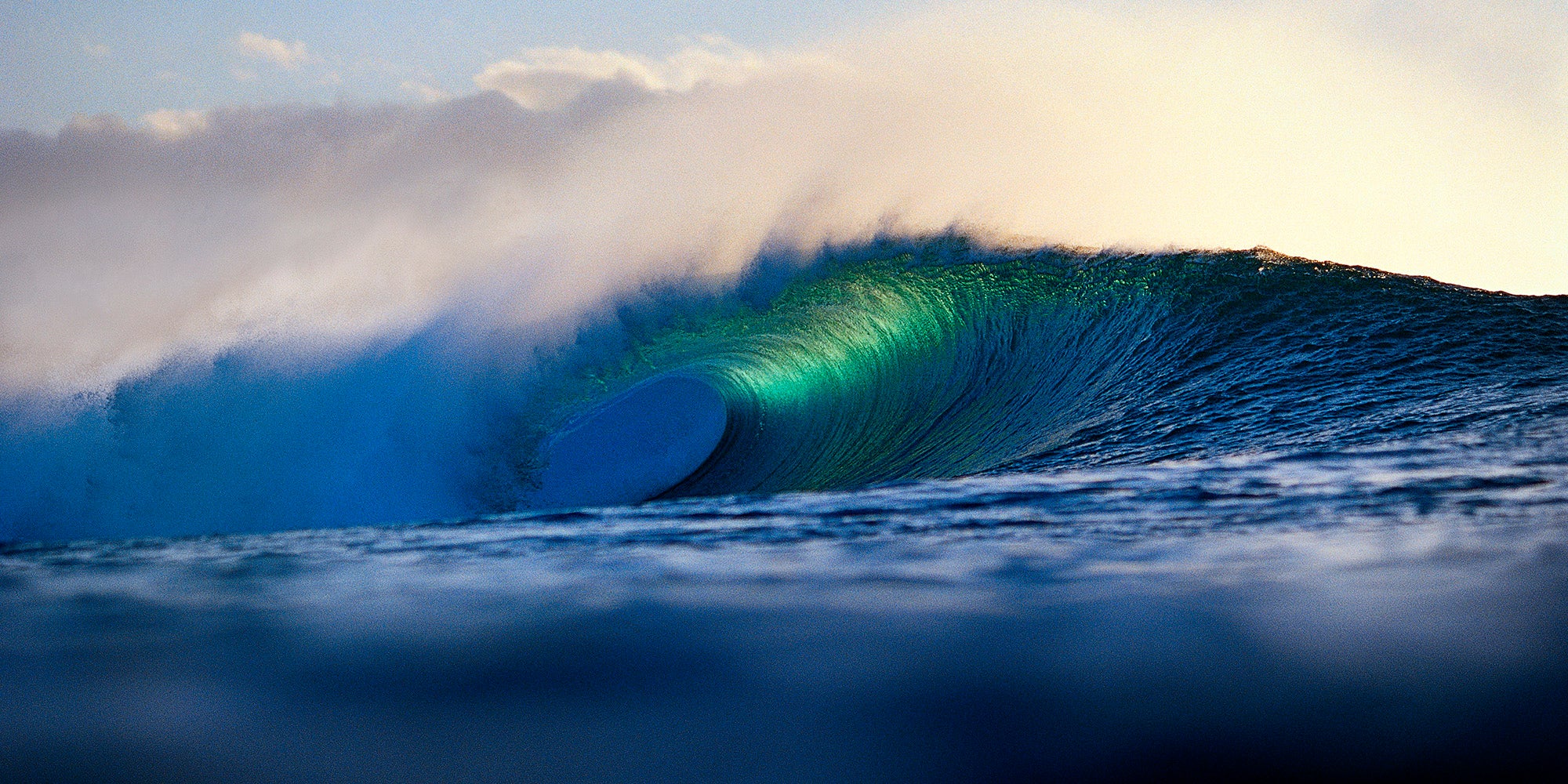Experience the power and majesty of this outer reef Hawaiian surf break at first light. Soft sunlight illuminates the mist flying off the powerful lip of a wave breaking in the deep ocean.
