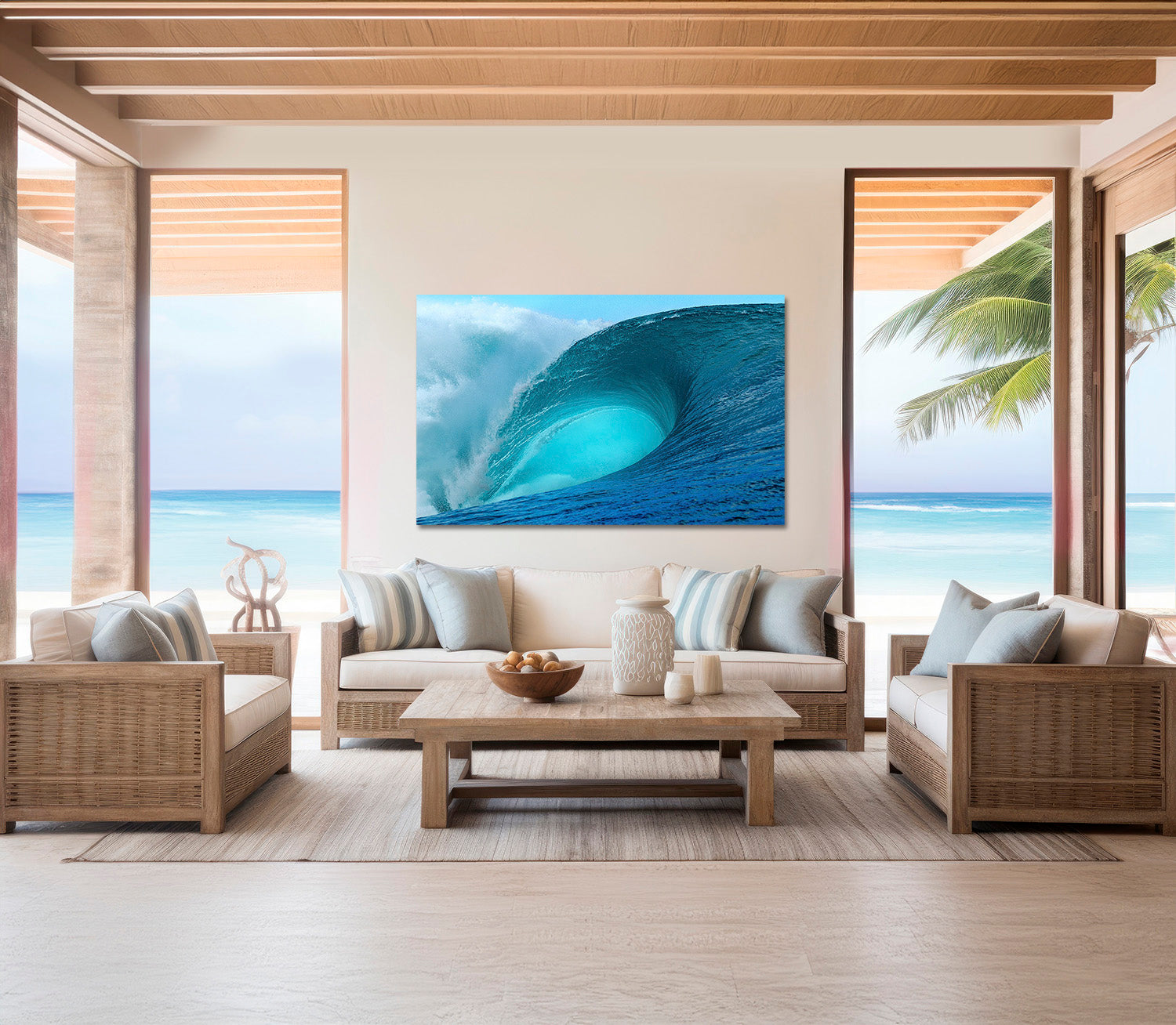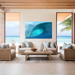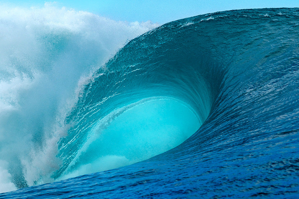 In this moment, the wave’s signature thick lip doesn’t merely rise up but rather hurls itself forward, creating a massive wall of brilliant turquoise water that appears to defy physics as it forms a perfect barrel.