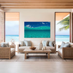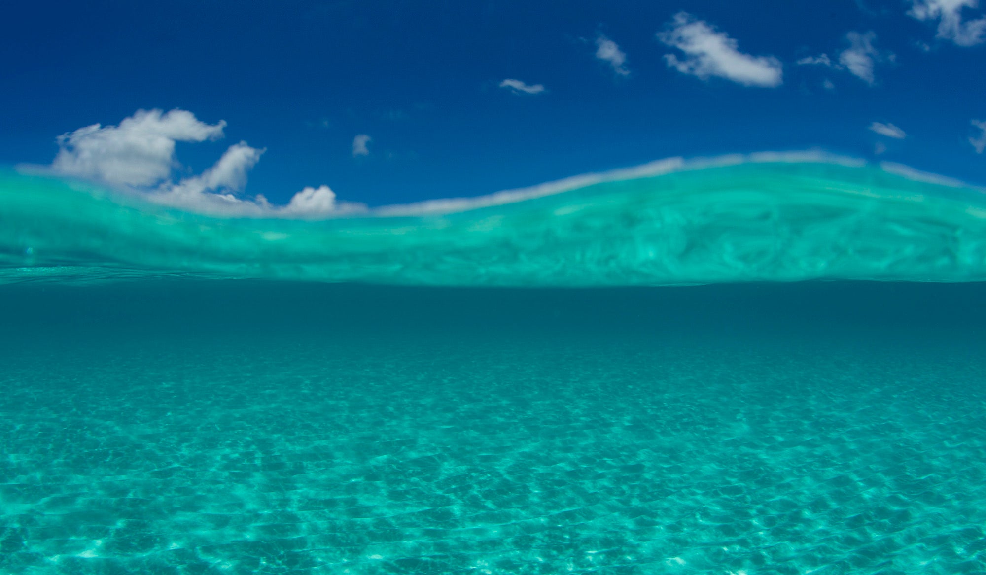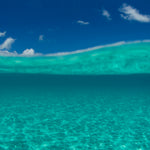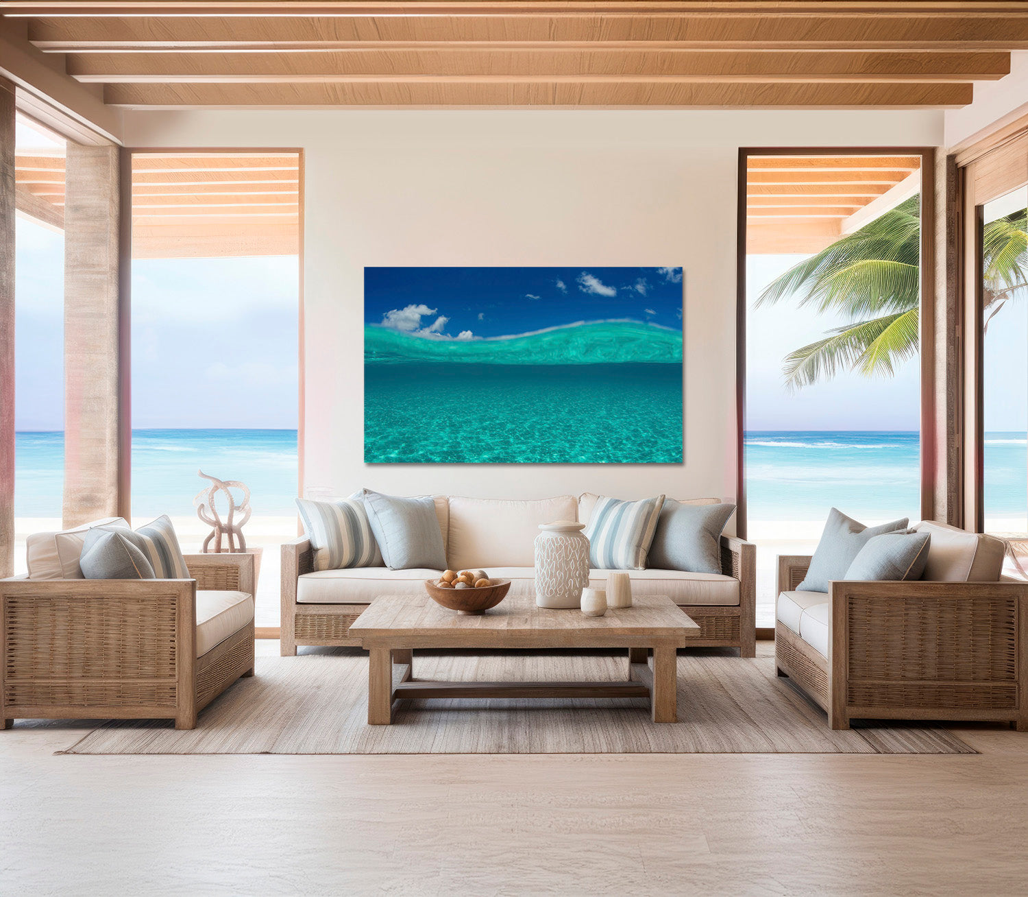 This stunning photo captures a split view of a crystal-clear turquoise ocean beneath a vibrant blue sky.