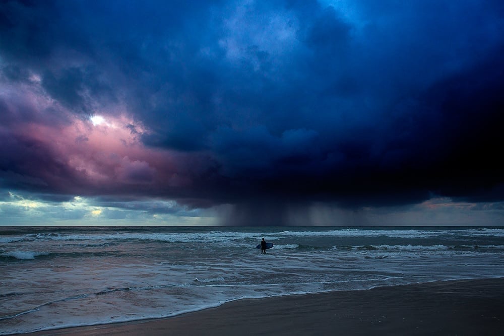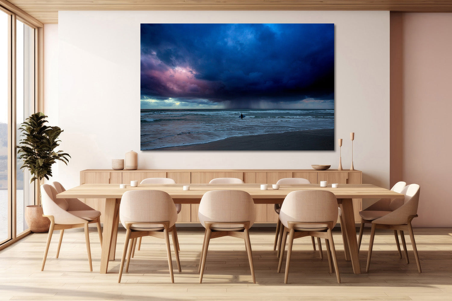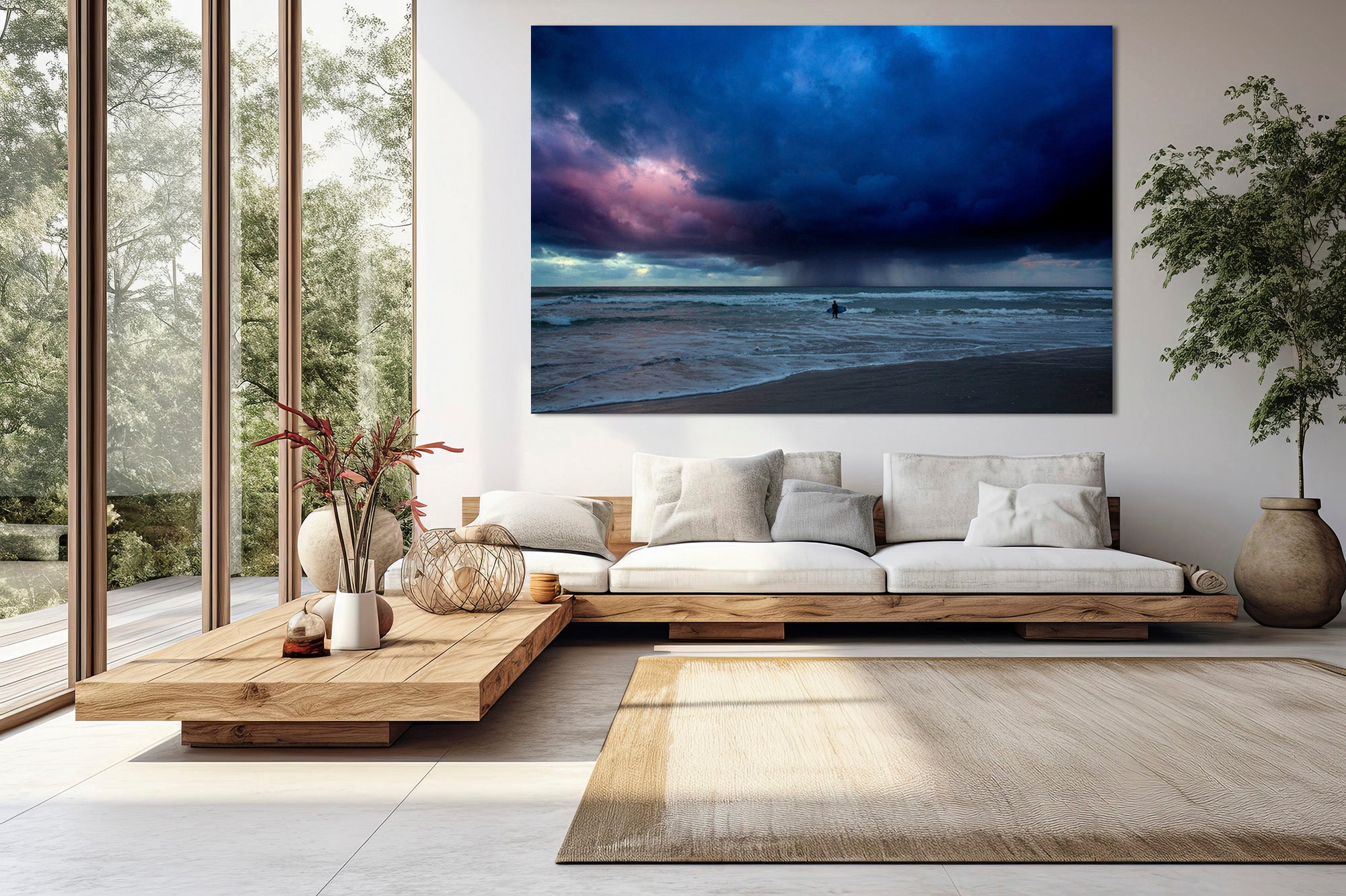 Undeterred by the looming weather, she embodies the unwavering passion and commitment that drives her to face the elements. This fine art photograph captures both the raw beauty of nature and the indomitable spirit of those drawn to the sea.