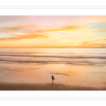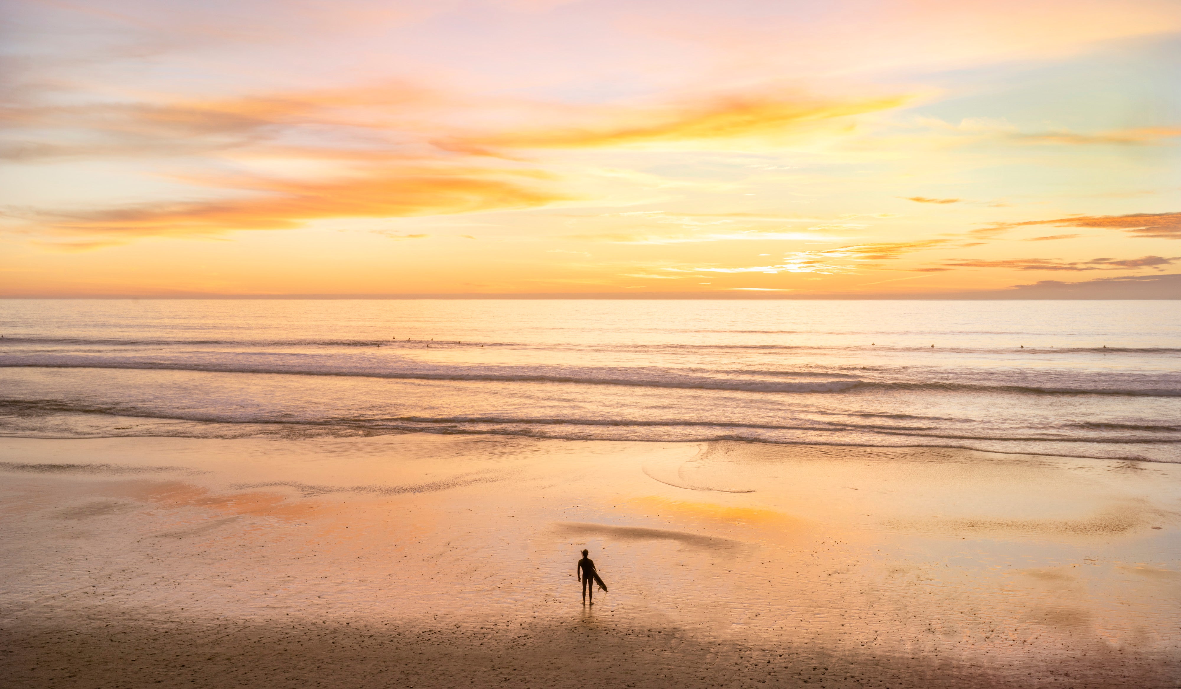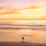 A solitary surfer stands at the water’s edge, gazing toward the horizon— embodying the universal search for perspective and renewal.