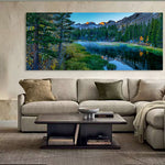 This tranquil alpine scene captures the Sierra Nevada at dawn, where morning mist drifts across  pristine mountain waters and the first golden rays of sun ignite the granite peaks in warm amber tones.