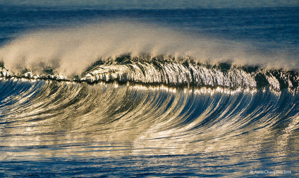The soft silver light of dawn is captured in the face of this majestic wave, photographed off the coast of Laguna Beach. A light Santa Ana off-shore wind blows a fan of fine mist around this perfectly formed gem from the sea.