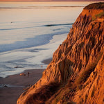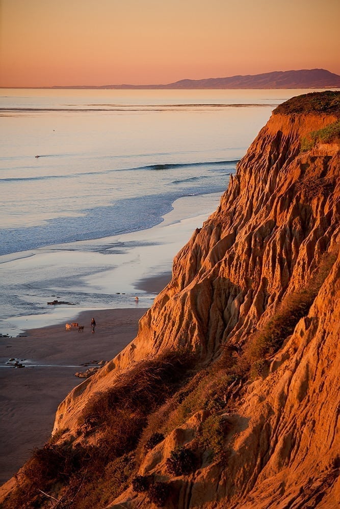 The warm, golden light bathes the dramatic cliffs and serene shoreline. Below, beachgoers stroll along the sand, enjoying the peaceful ambiance of this coastal haven.