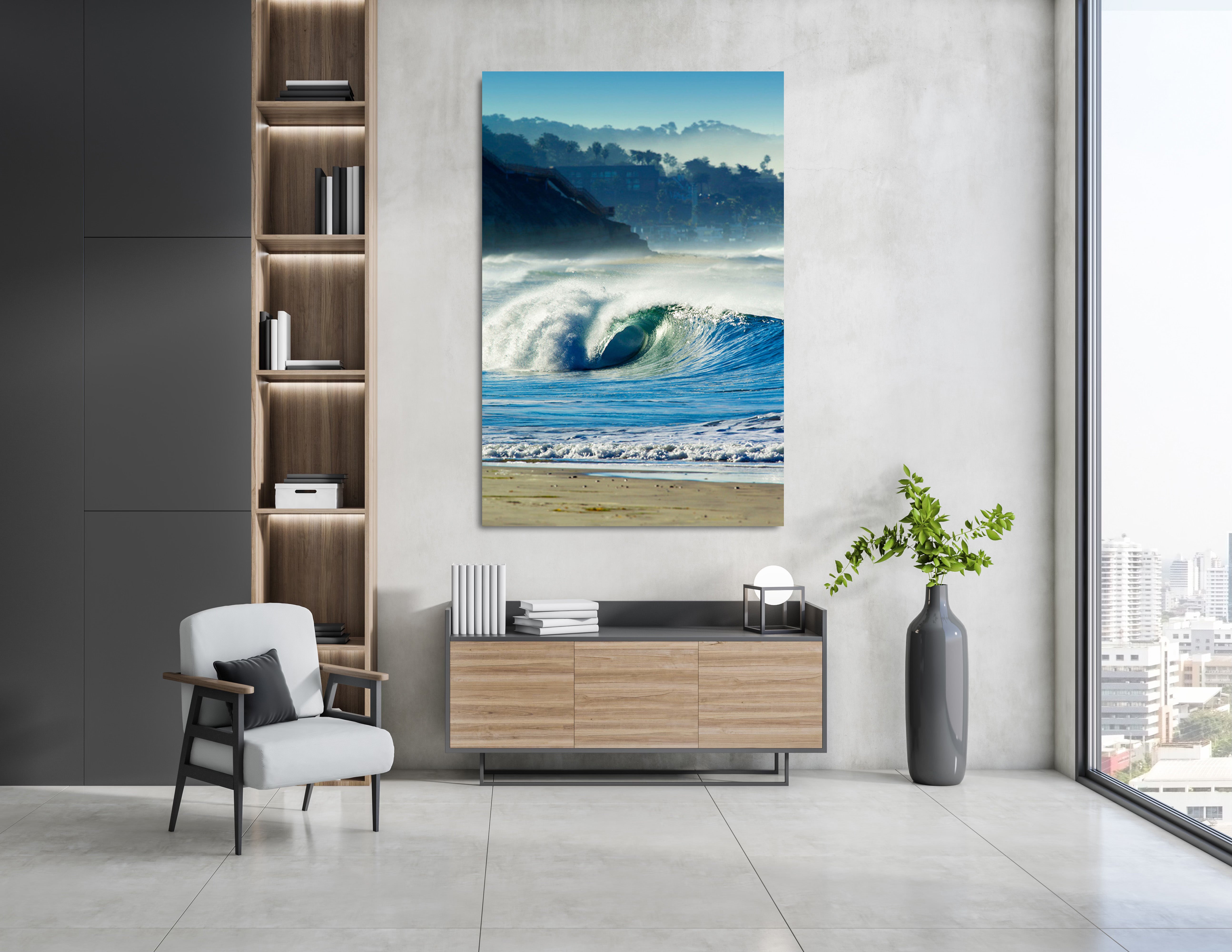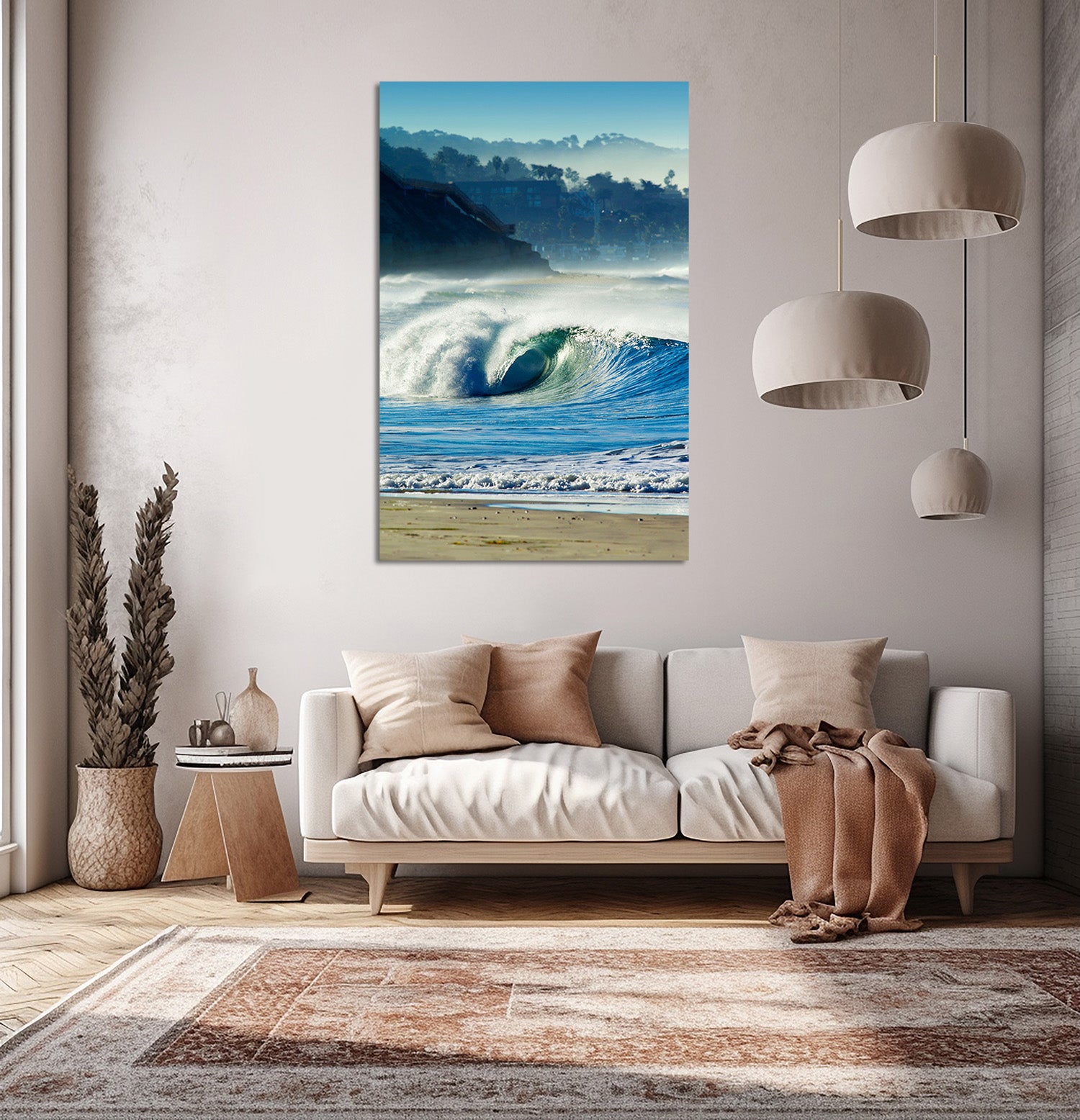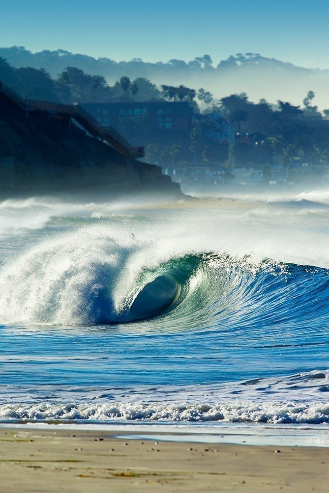 A pristine wave curls gracefully off the shore of Solana Beach, captured in this striking surf photograph.