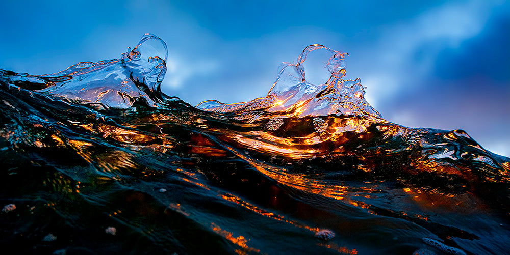 The wave’s glassy lip creates an ephemeral canvas where celestial-like formations sparkle along its crest, each one catching and refracting the waning light into prismatic brilliance.