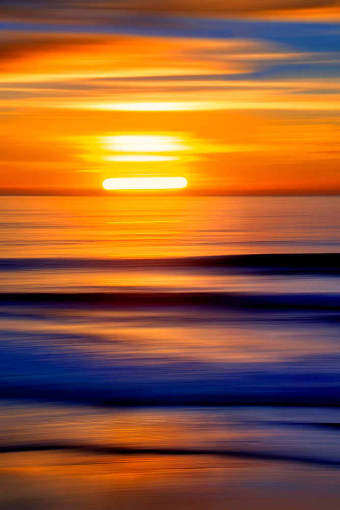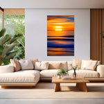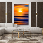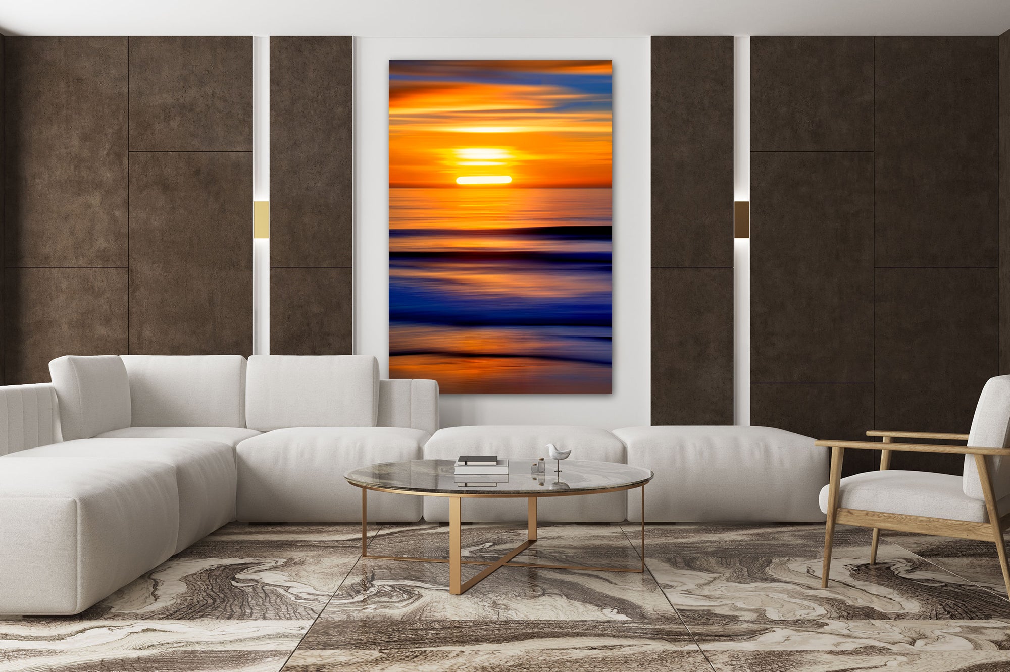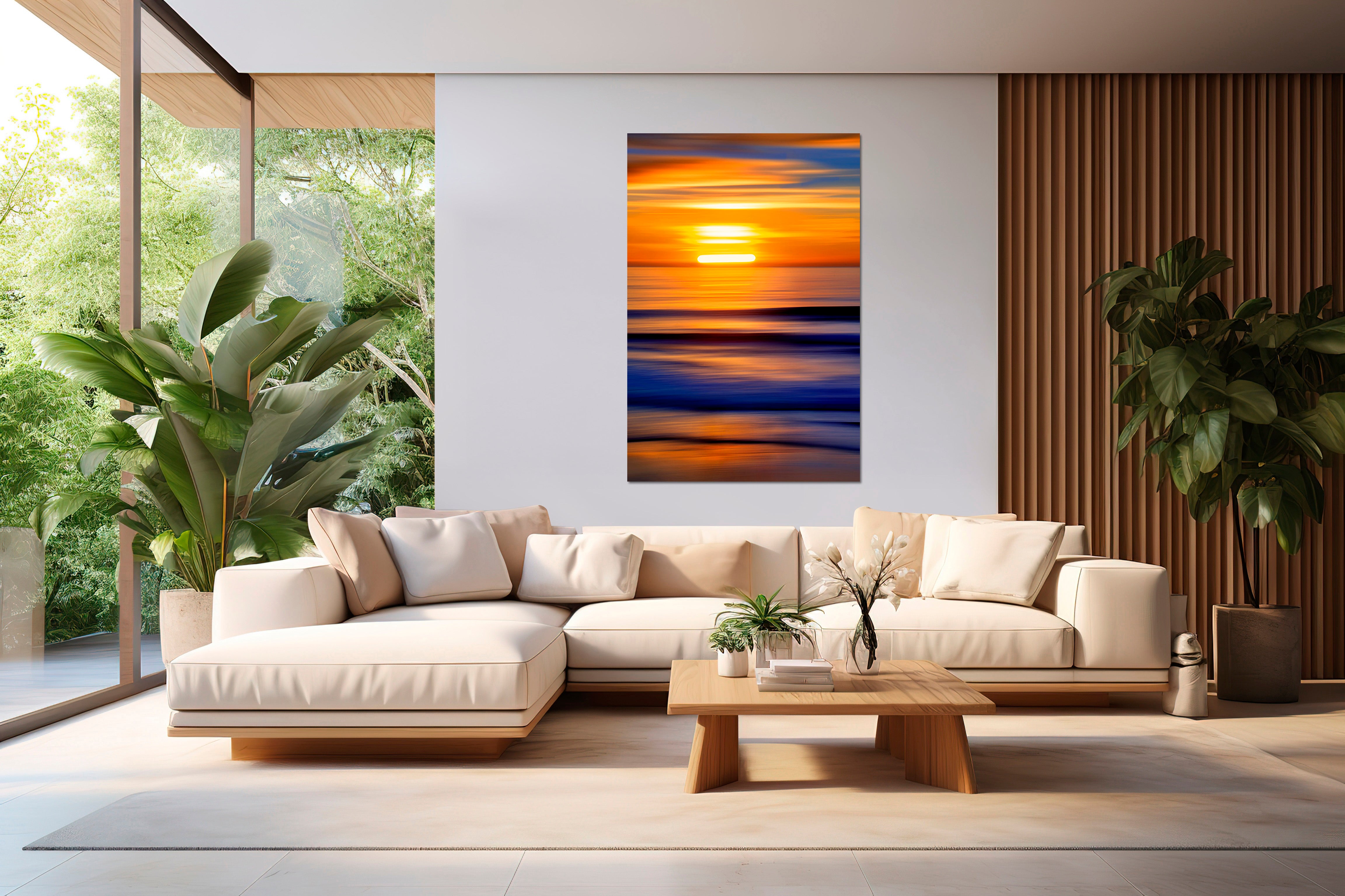 This captivating abstract masterpiece evokes the transcendent beauty of a Pacific sunset, where the sun descends into the horizon in a blaze of brilliant yellows and fiery oranges that illuminate the entire skyscape.