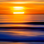 The artist’s photographic technique transforms the scene into a dreamlike vision, where time seems suspended between day and night, inviting viewers to lose themselves in the stunning sunset on the Pacific Ocean.