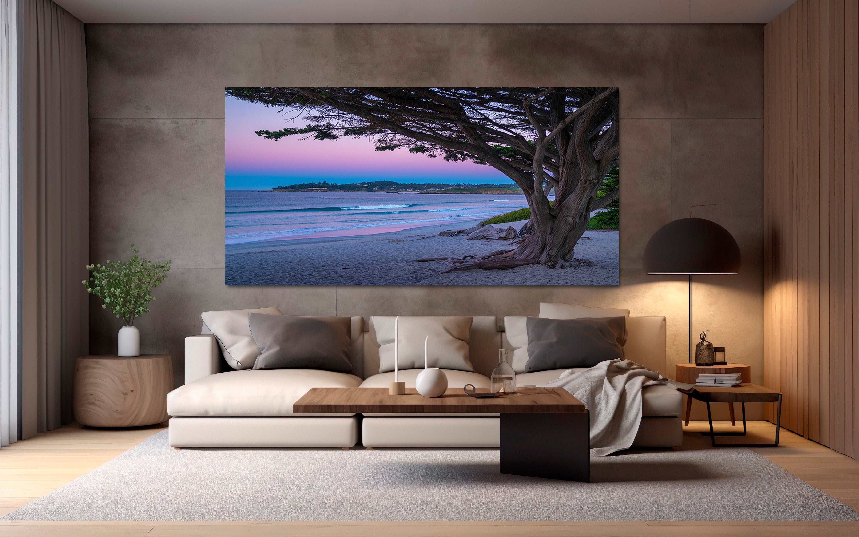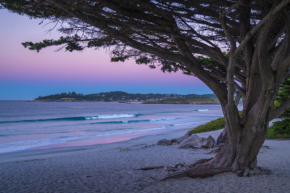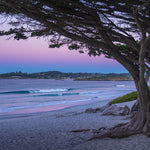 Carmel Beach transforms into a dreamscape during the morning light, with soft pastel hues illuminating the pristine white sands and the cypress trees creating dramatic silhouettes against the awakening sky.