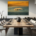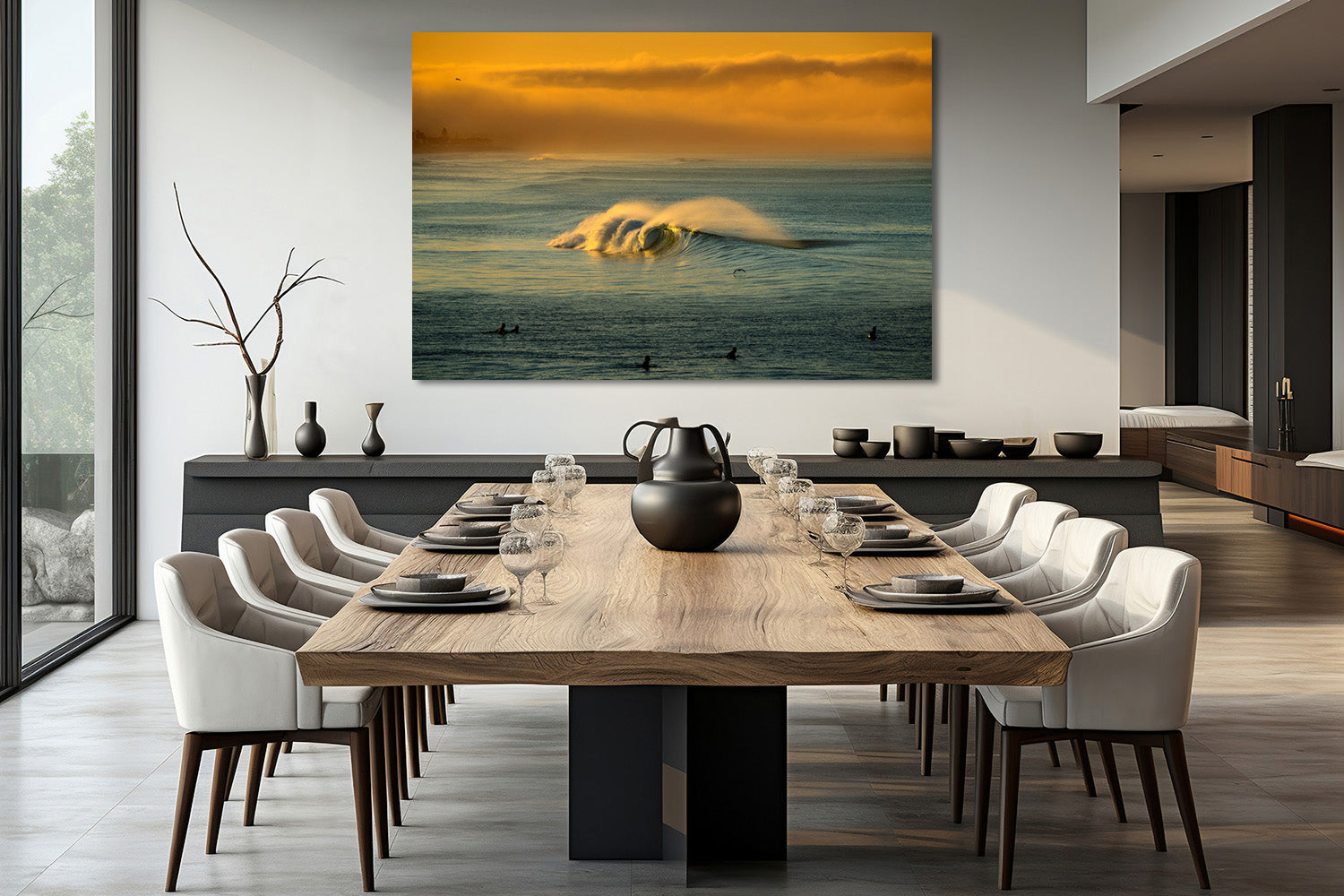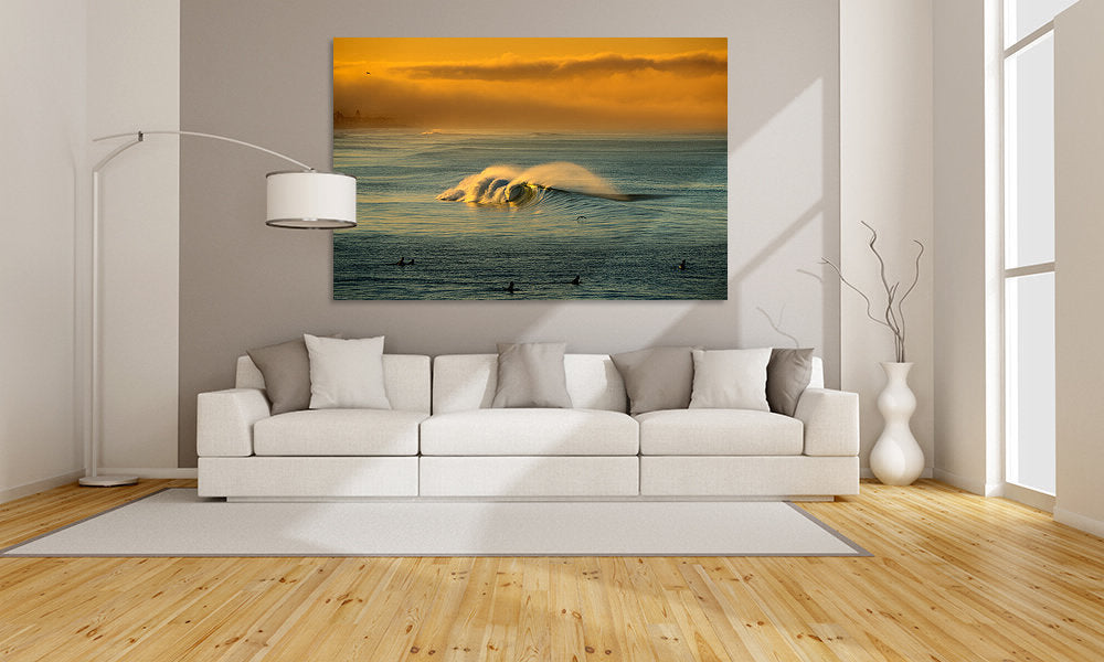 Silhouetted against the amber horizon, surfers await the next wave, feeling the joy of the ocean's energy and it's exhilarating ride.